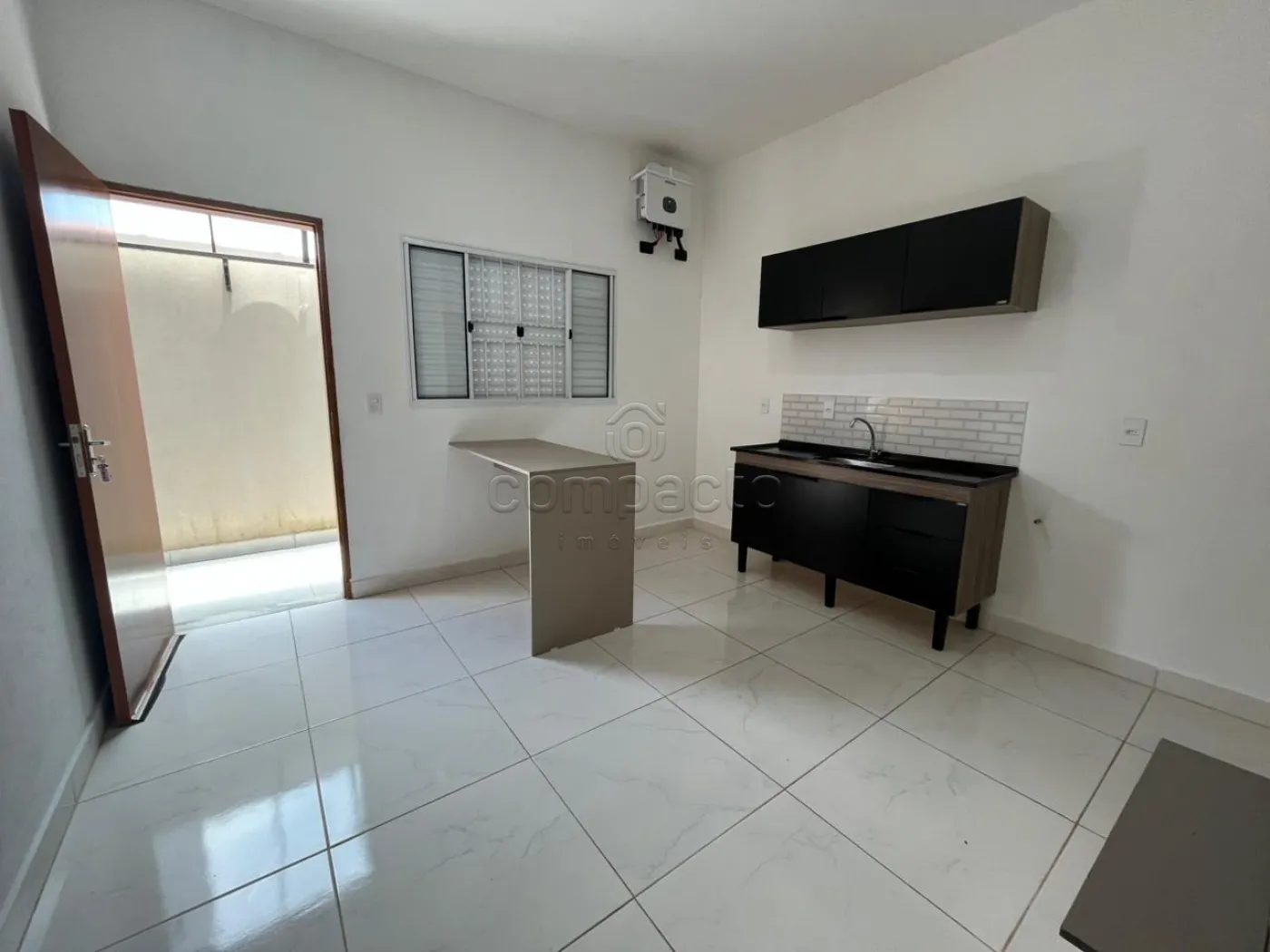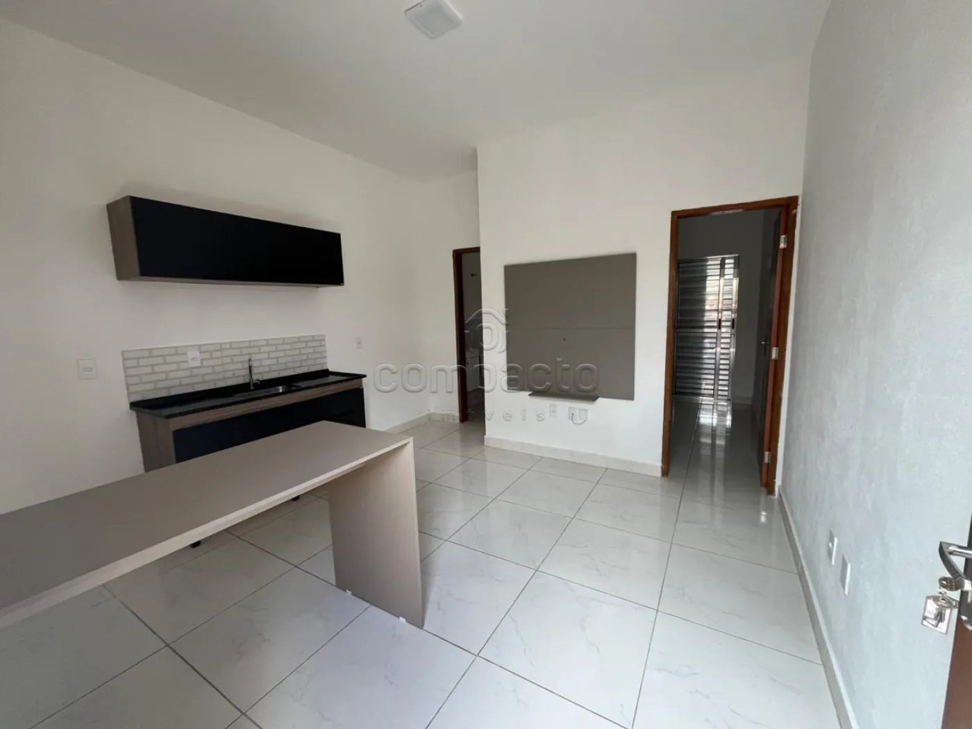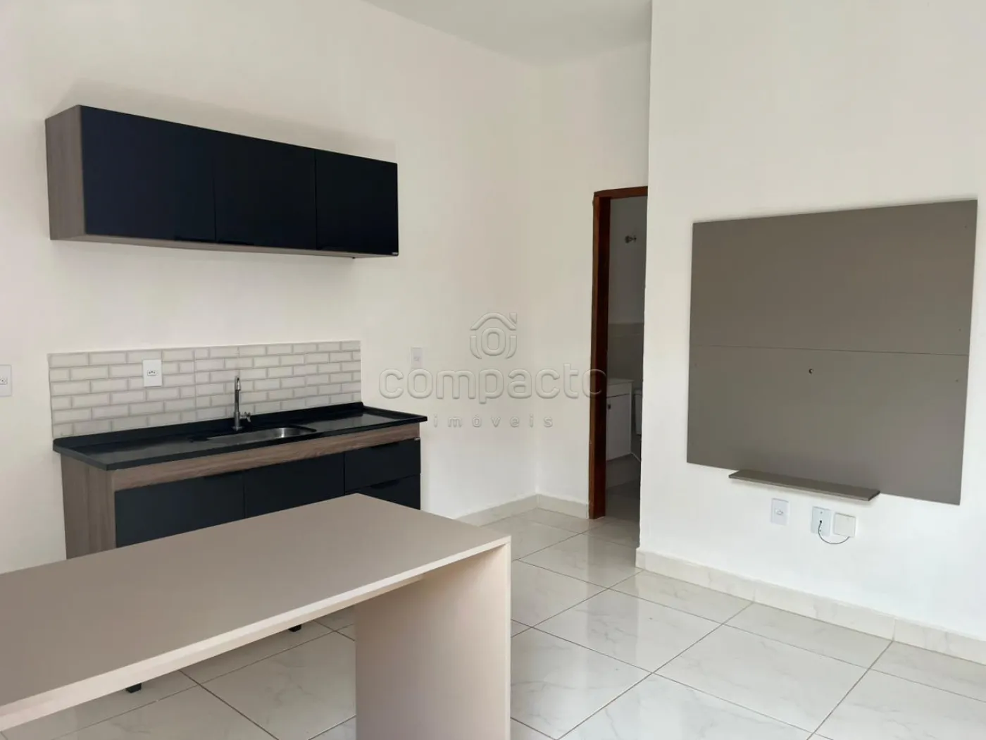 Apartamento novo com 1 dormitório, sala com cozinha americana, wc e área de serviço. O imóvel possui cozinha com balcão e armário, banheiro com gabinete e box blindex, área de serviço com tanque e espaço coberto para maquina de lavar, além de espaço para varal ou área de descanso.