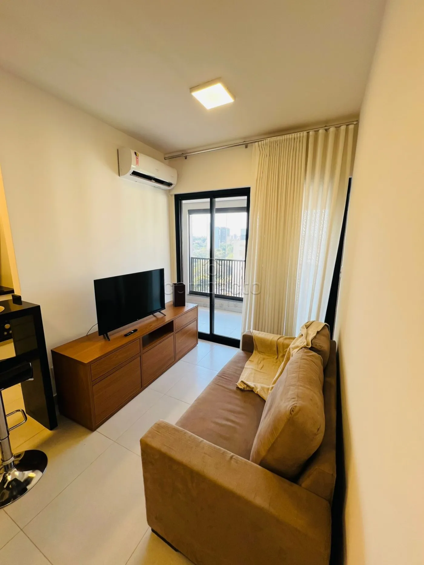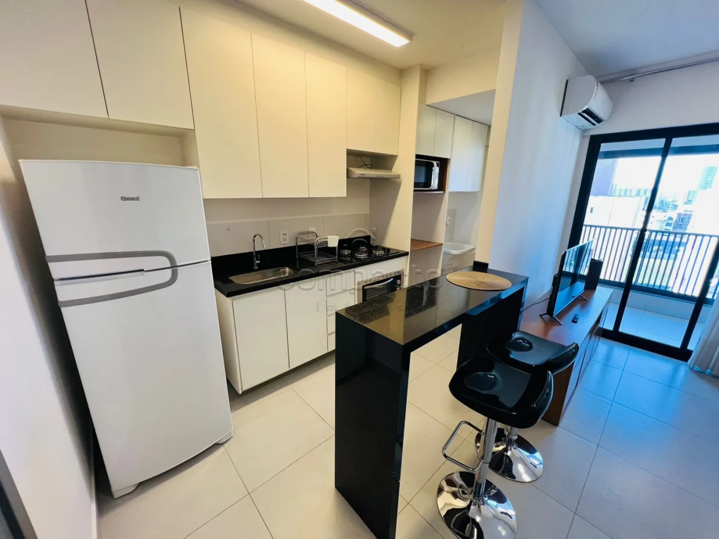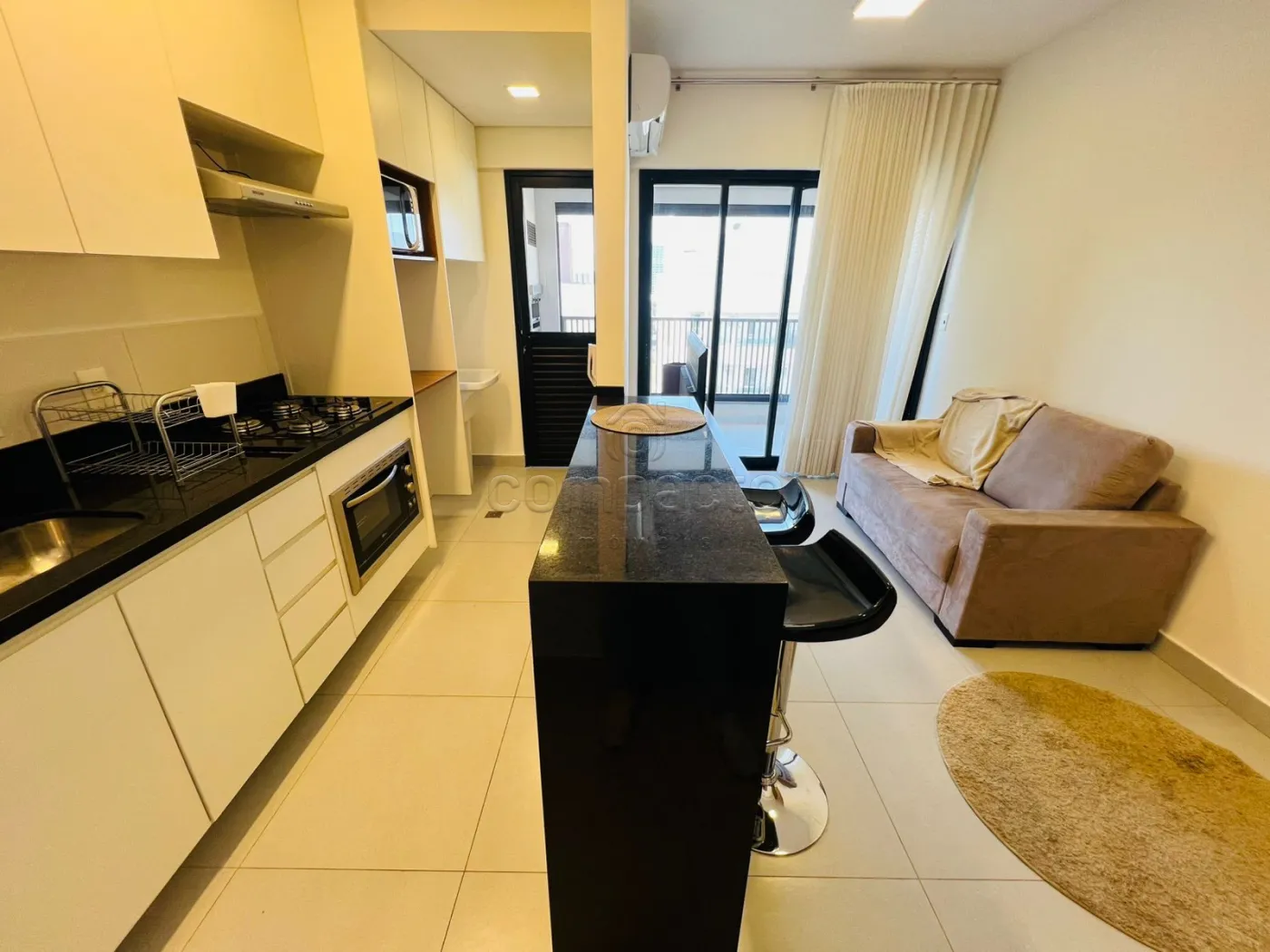 Apartamento mobiliado com 1 dormitório, sala com sacada gourmet, cozinha planejada, área de serviço e WC social.