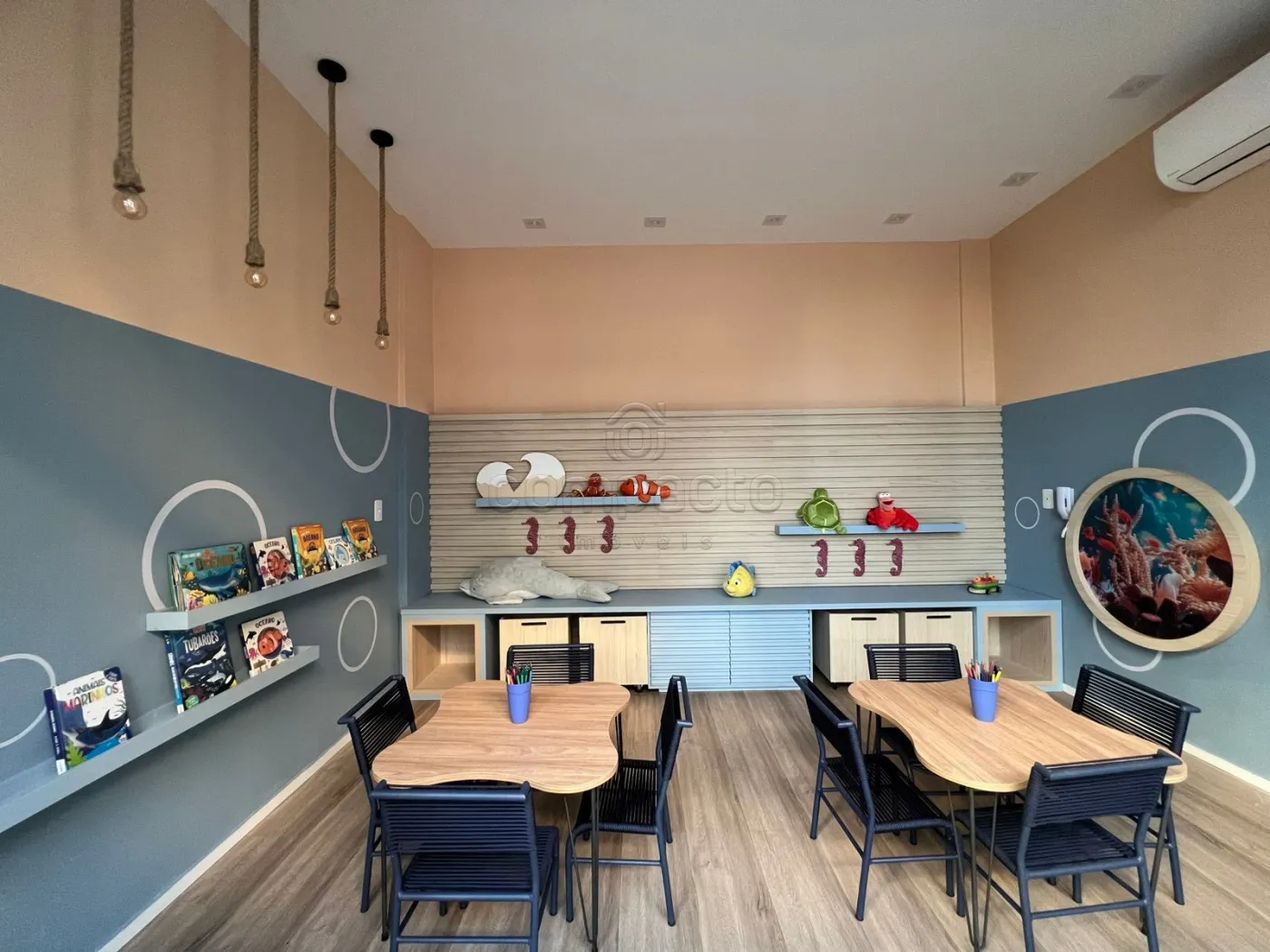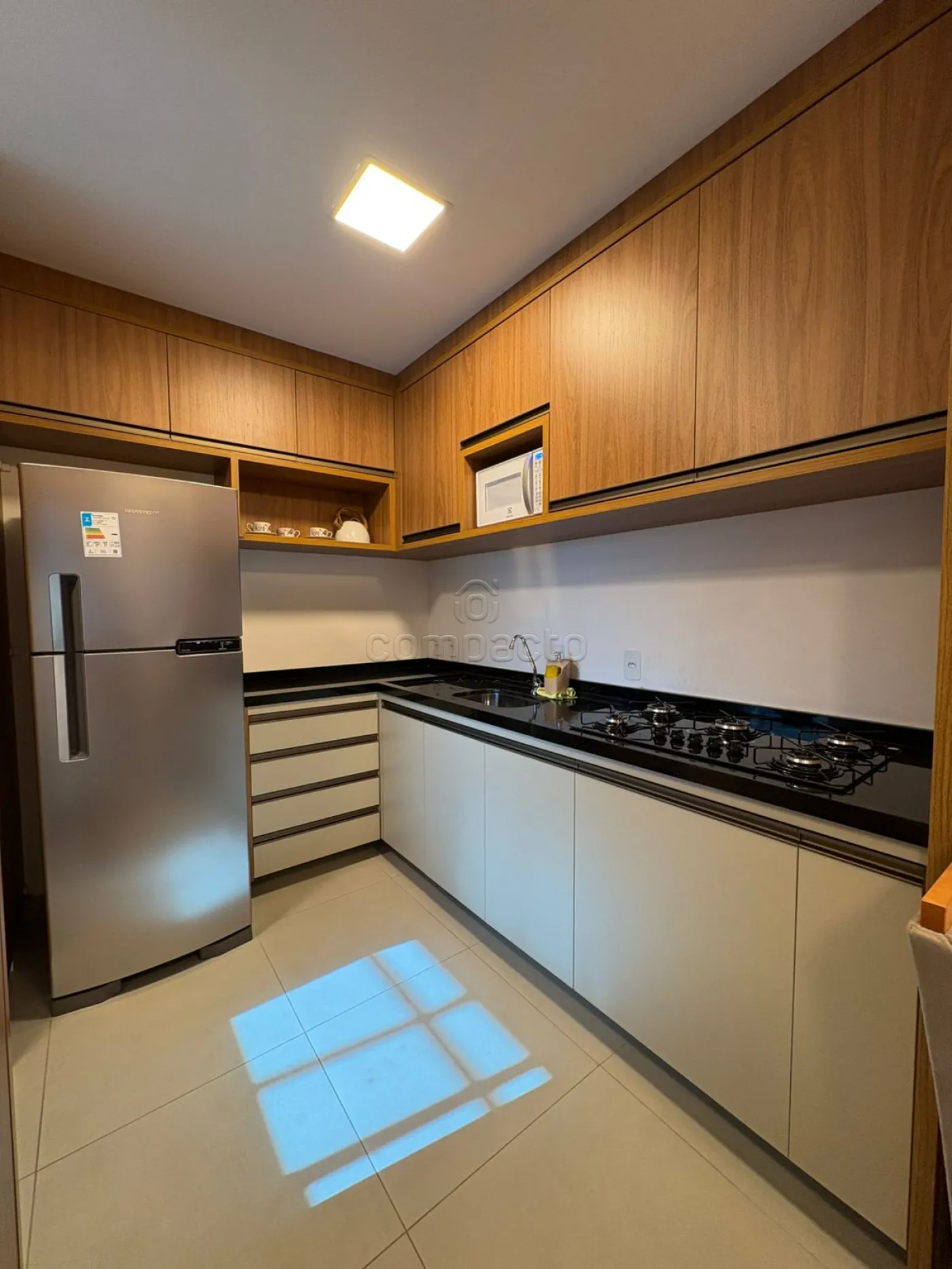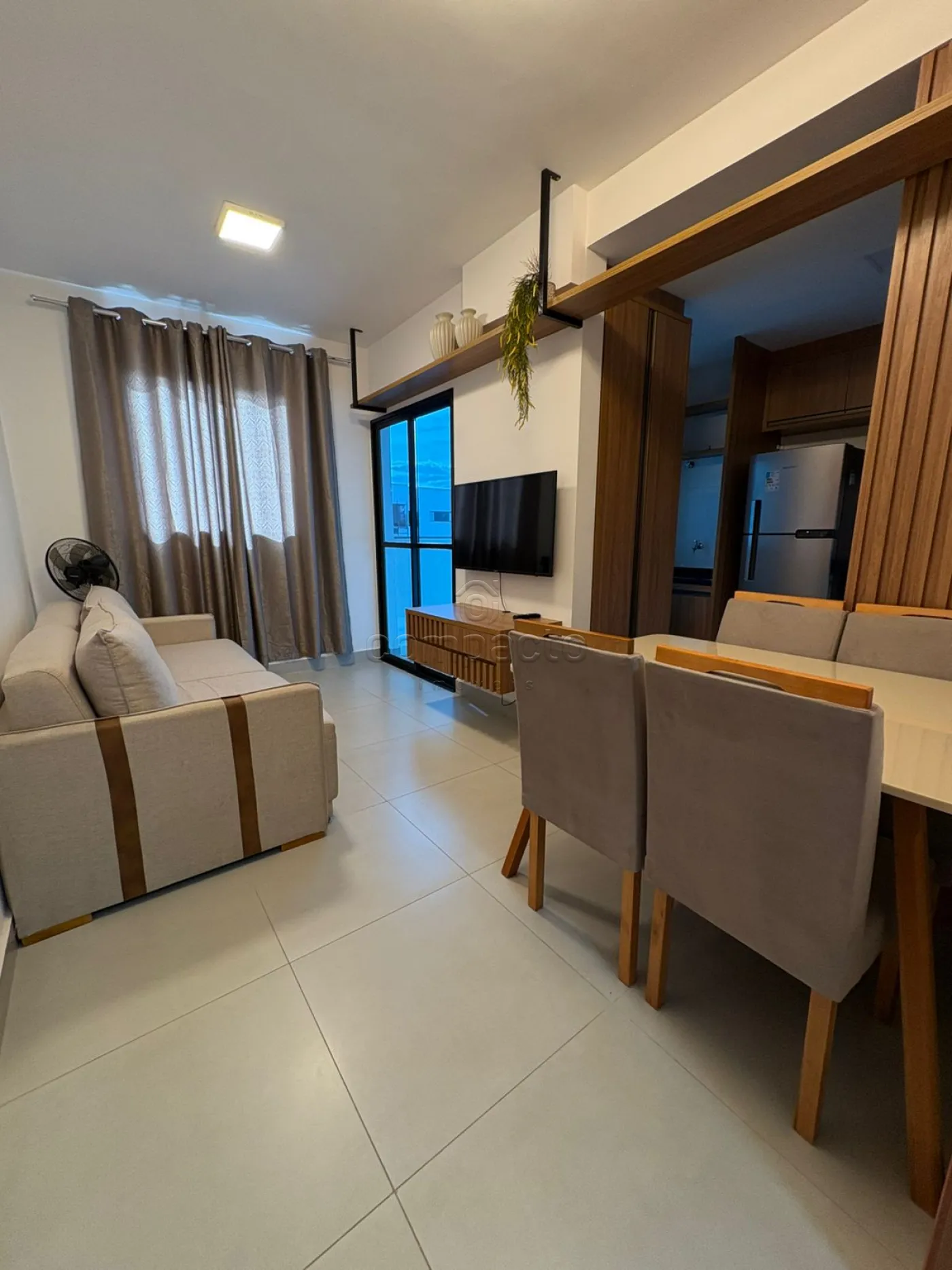 Possui 2 quartos com ar condicionado e armários, sala dois ambientes com sofá, TV e mesa de jantar, sacada, cozinha planejada com geladeira e cooktop, área de serviço e garagem coberta.