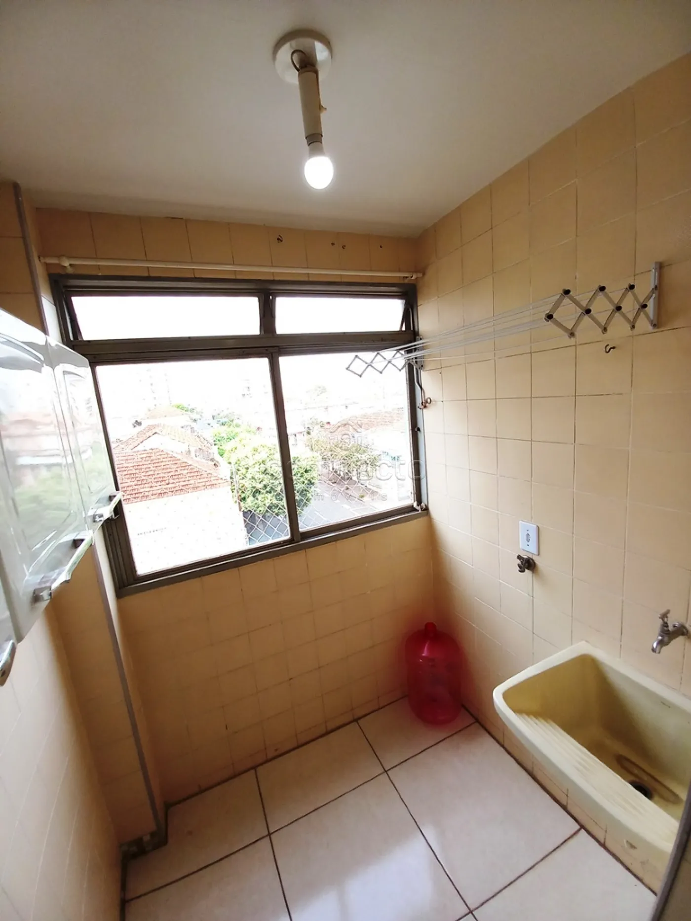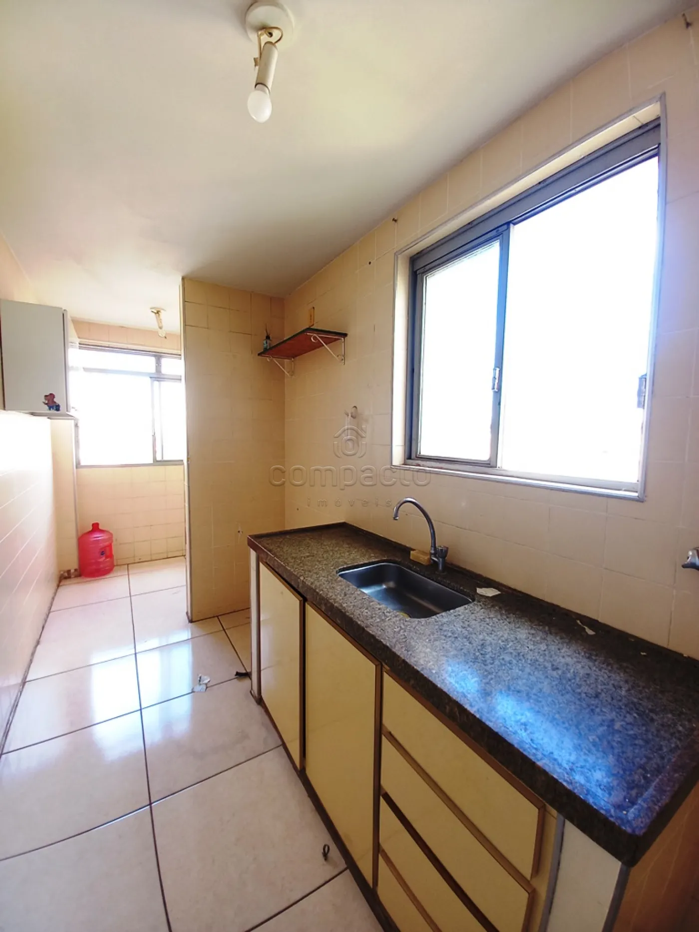Apartamento de 1 dormitório com armário, sala com sacada, wc social, cozinha com armário e área de serviço.