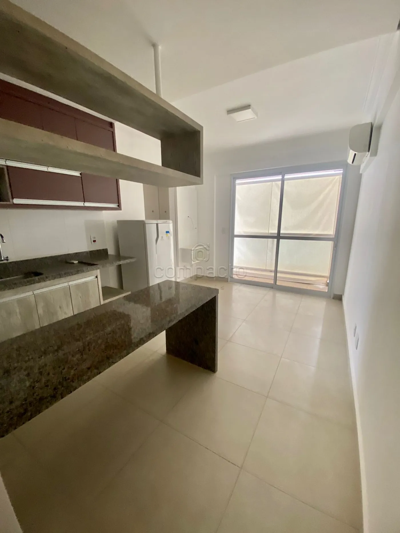 Apartamento de 1 dormitório com ar condicionado, cozinha com coocktop, painel de TV na sala e sacada.