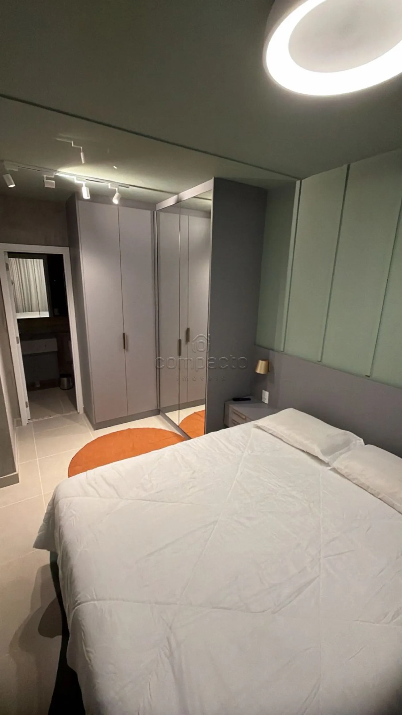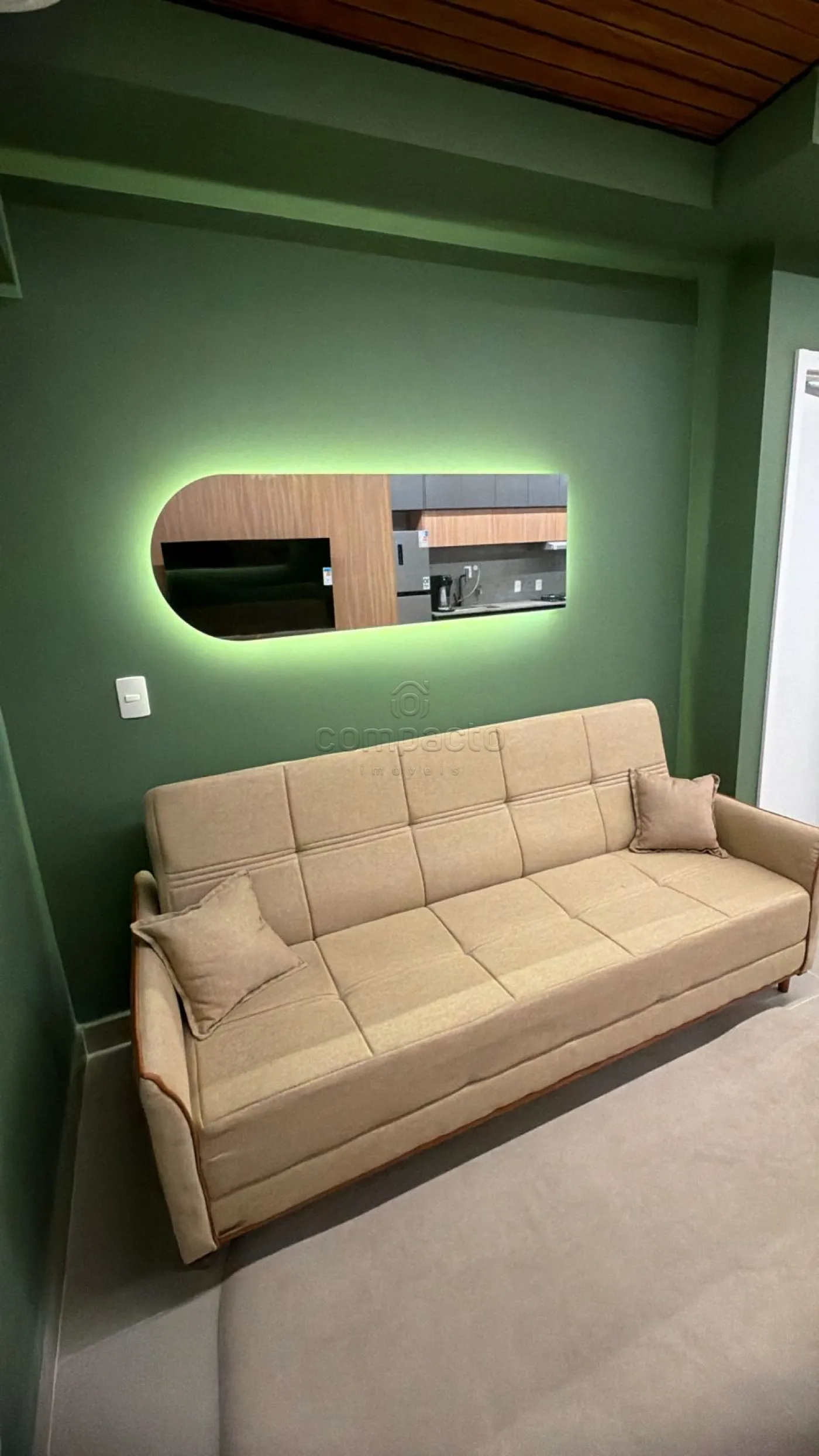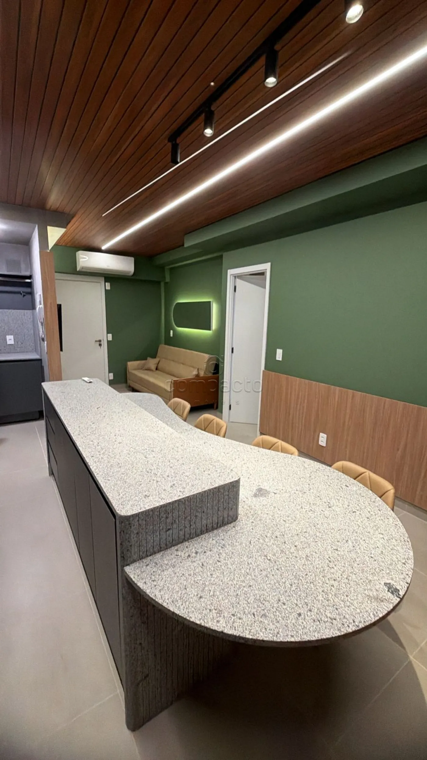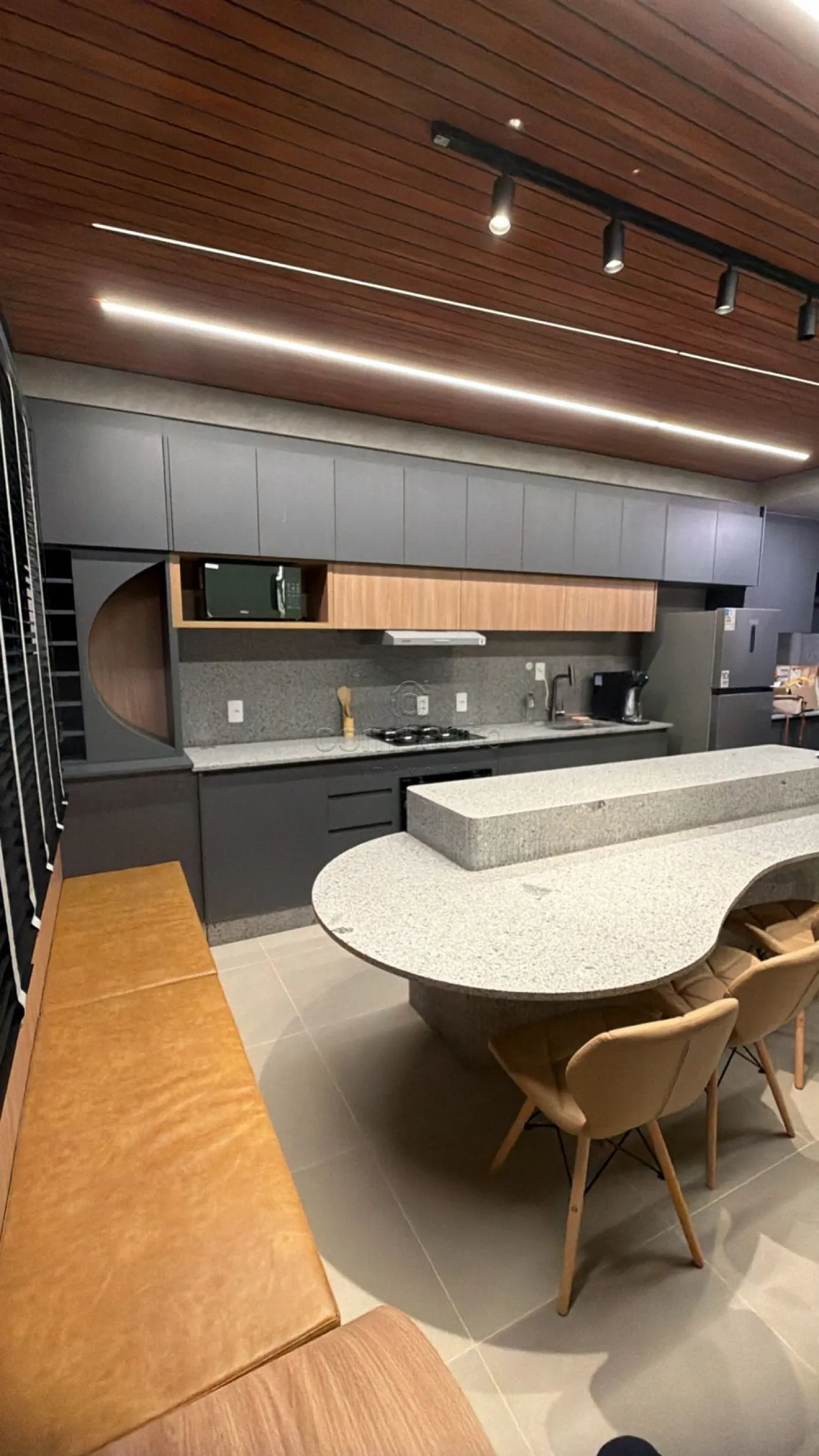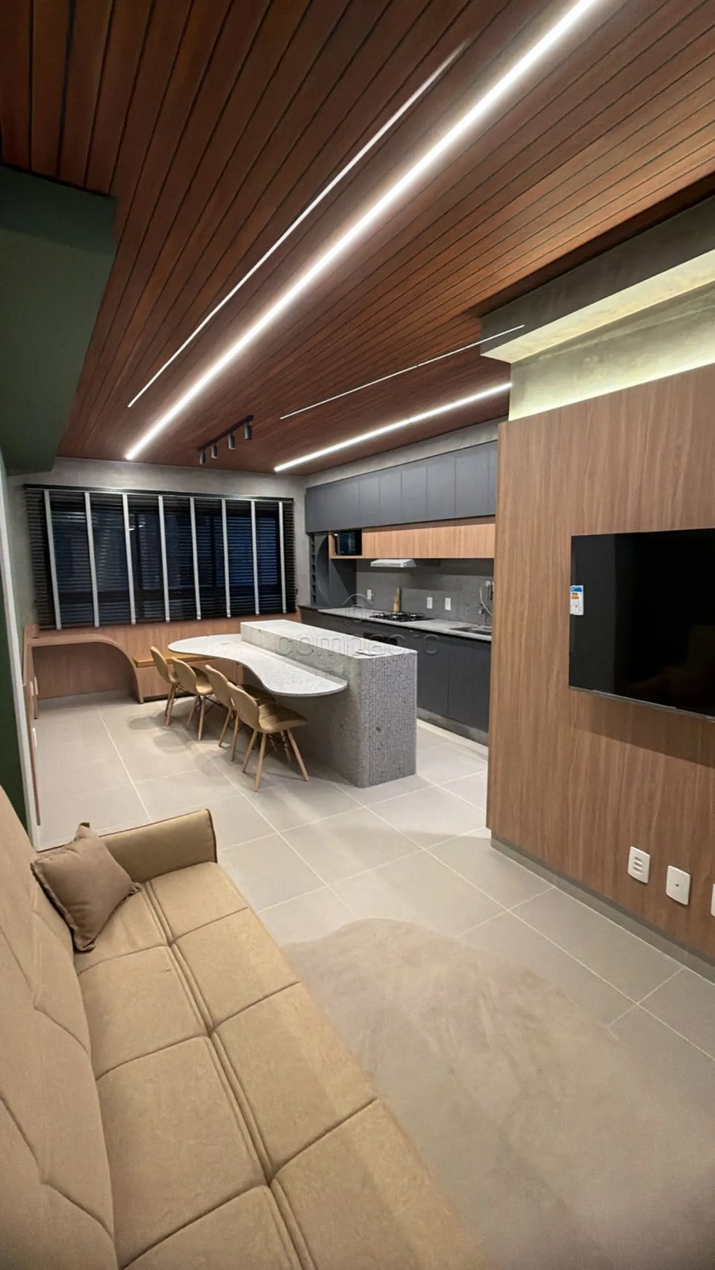 Contém: cooktop, forno a gás, geladeira, micro-ondas, lava e seca, cama queen, 02 TVs de 50`, sofá, Ilha com cadeiras, armários completos, tapete, louças, talher,