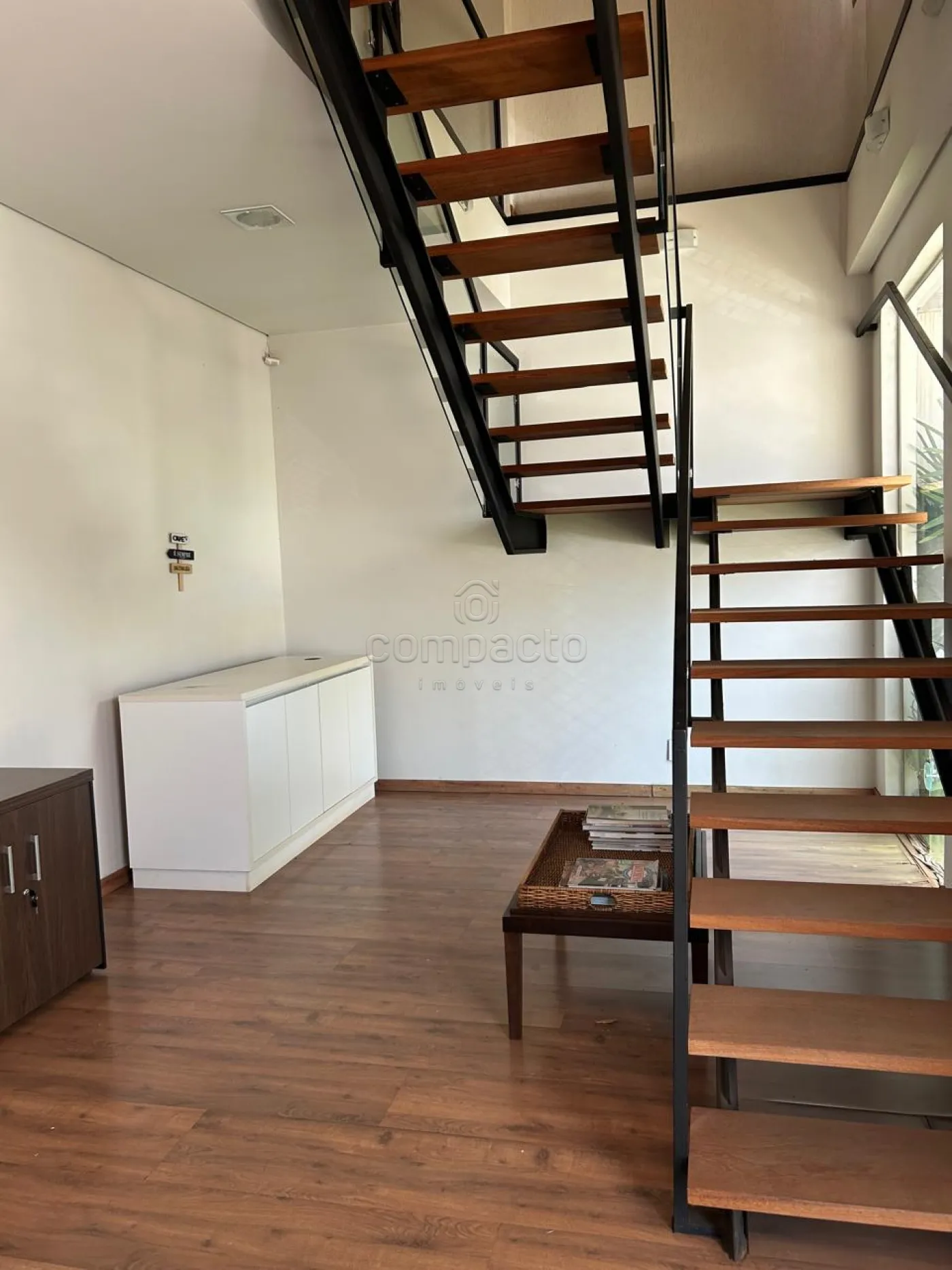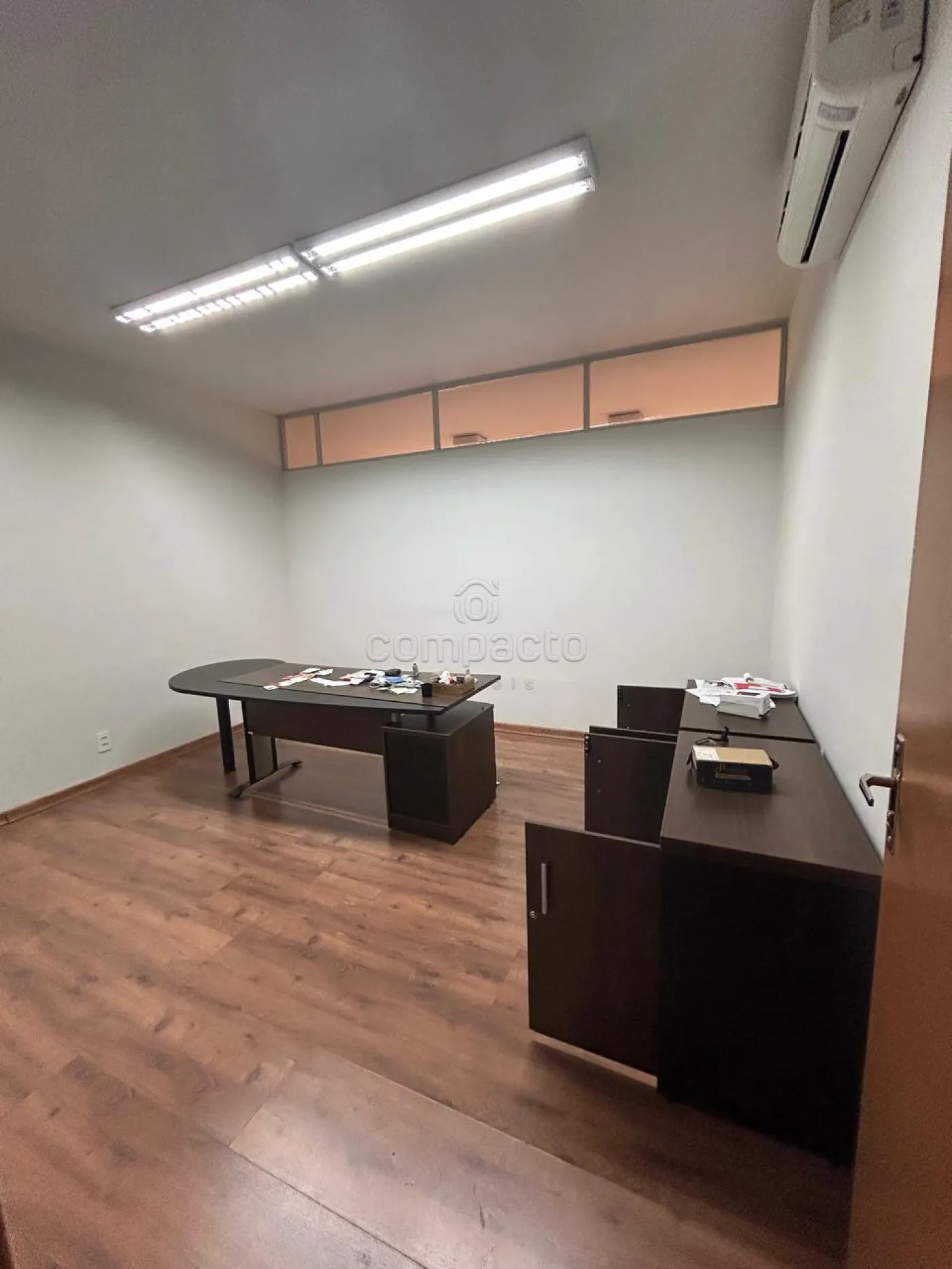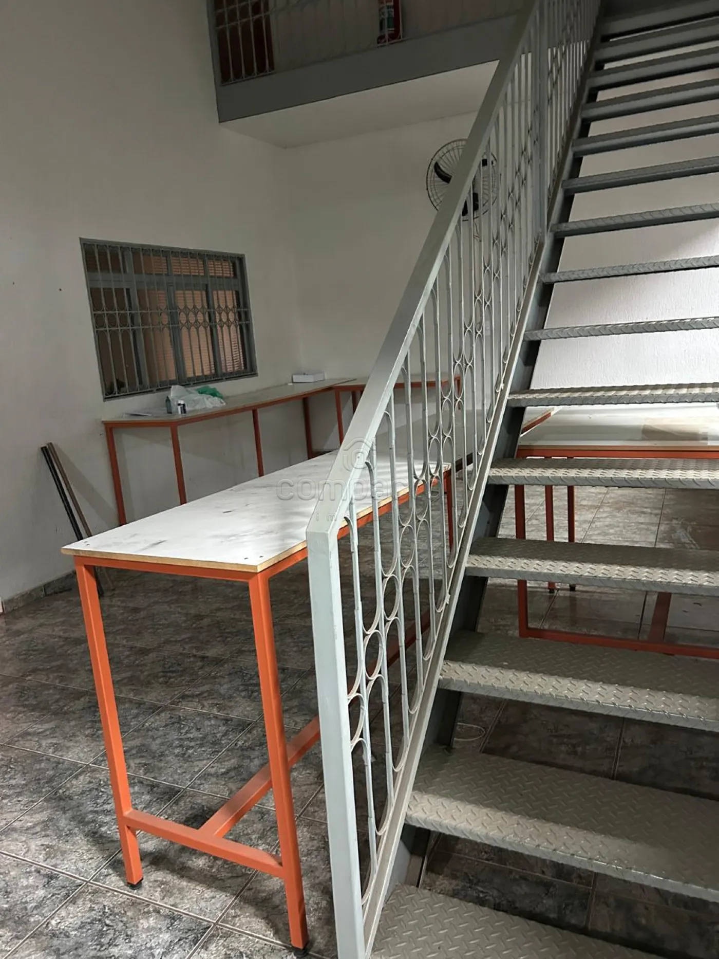 Parte superior com 4 salas, sendo 1 de reunião e outras de escritório, sendo que 3 delas com ar condicionado. Salas e recepção com mesas e recepção com balcão.