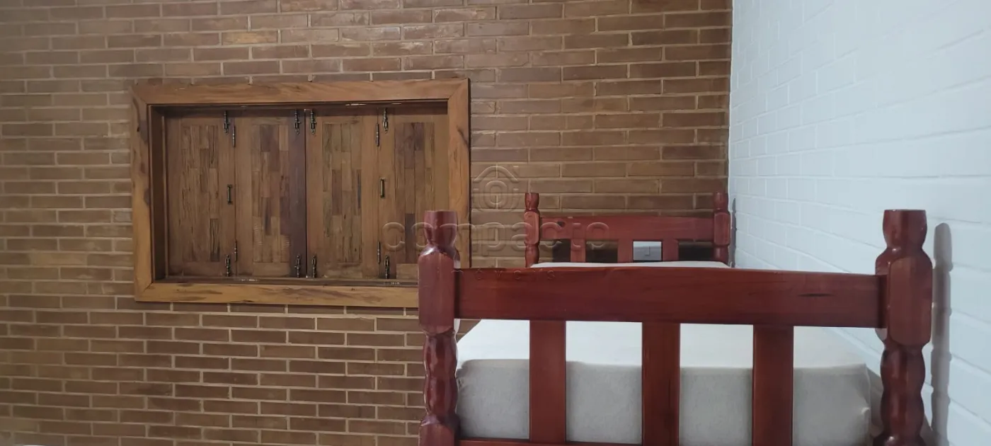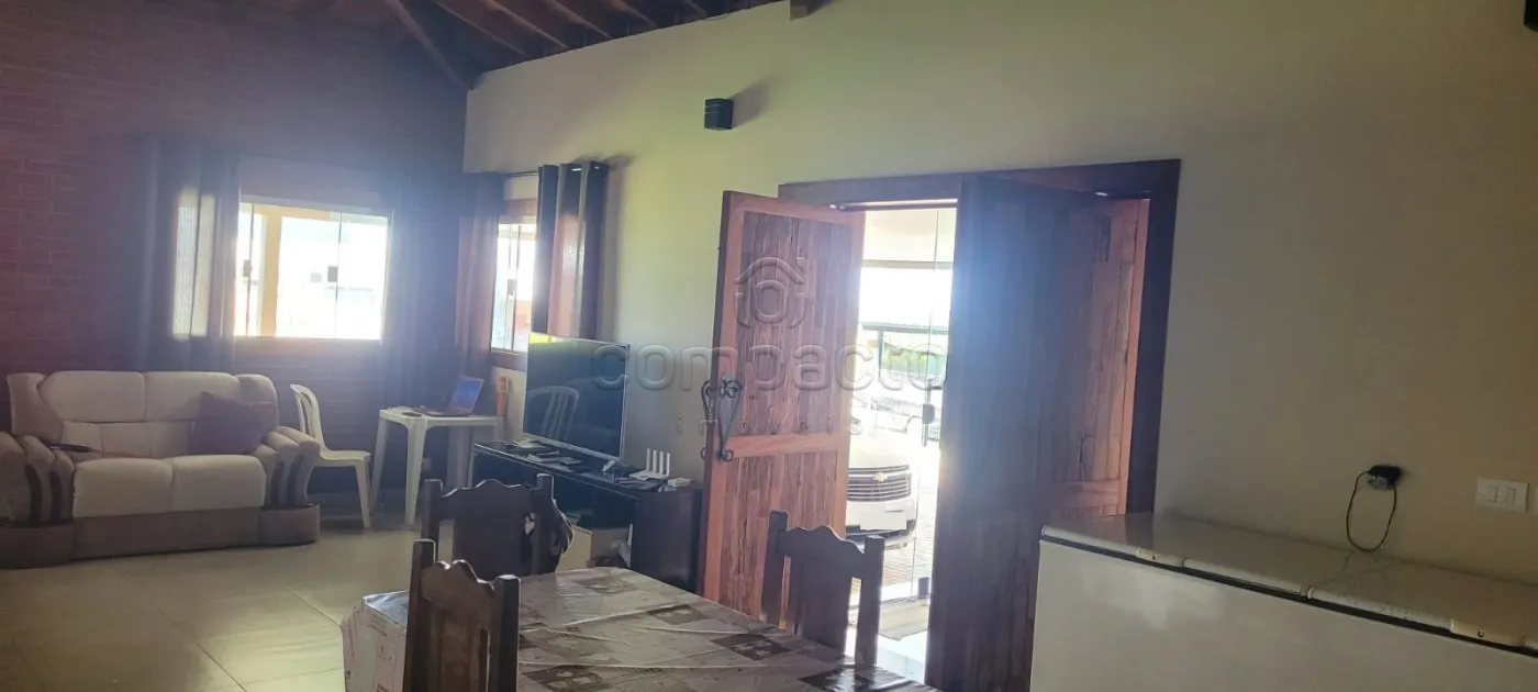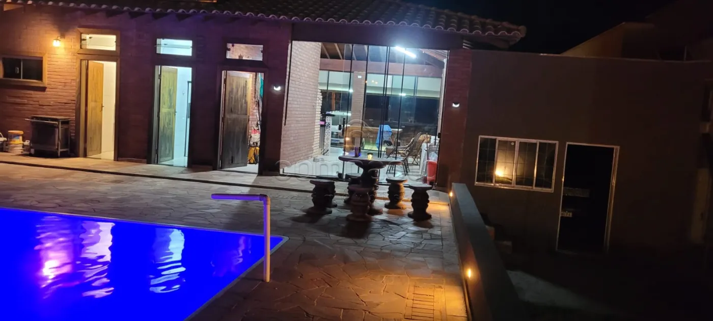 Rancho em condomínio alto padrão, com 4 dormitórios (todos com ar Split), sala para 2 ambientes, área gourmet fechada de vidro, balcão refrigerador cervejeira, churrasqueira, despensa, banheiro na área da piscina, lavanderia, guarda barco, garagem coberta, paisagismo, pomar, piscina aquecida rica em iluminação e amplo estacionamento.