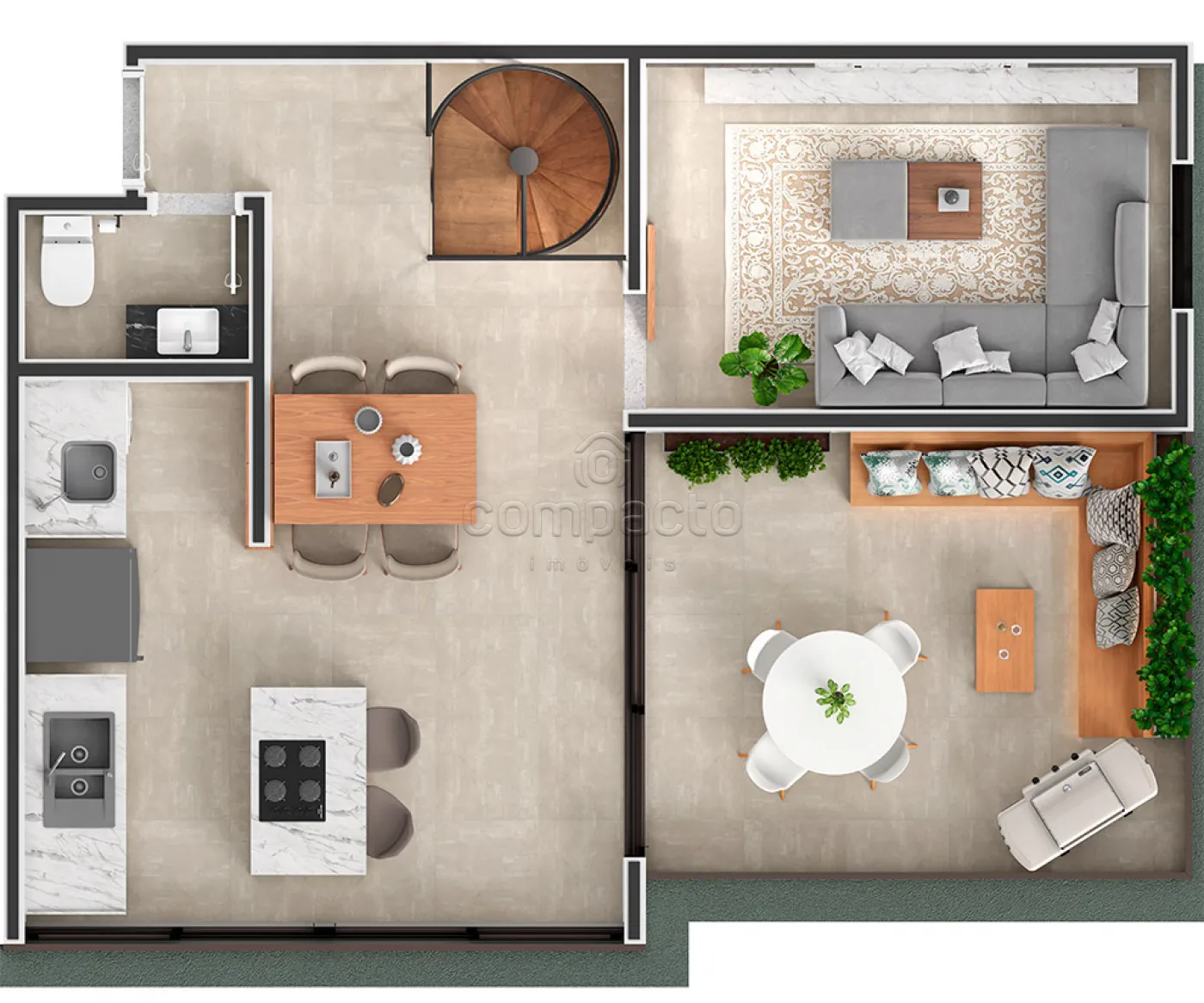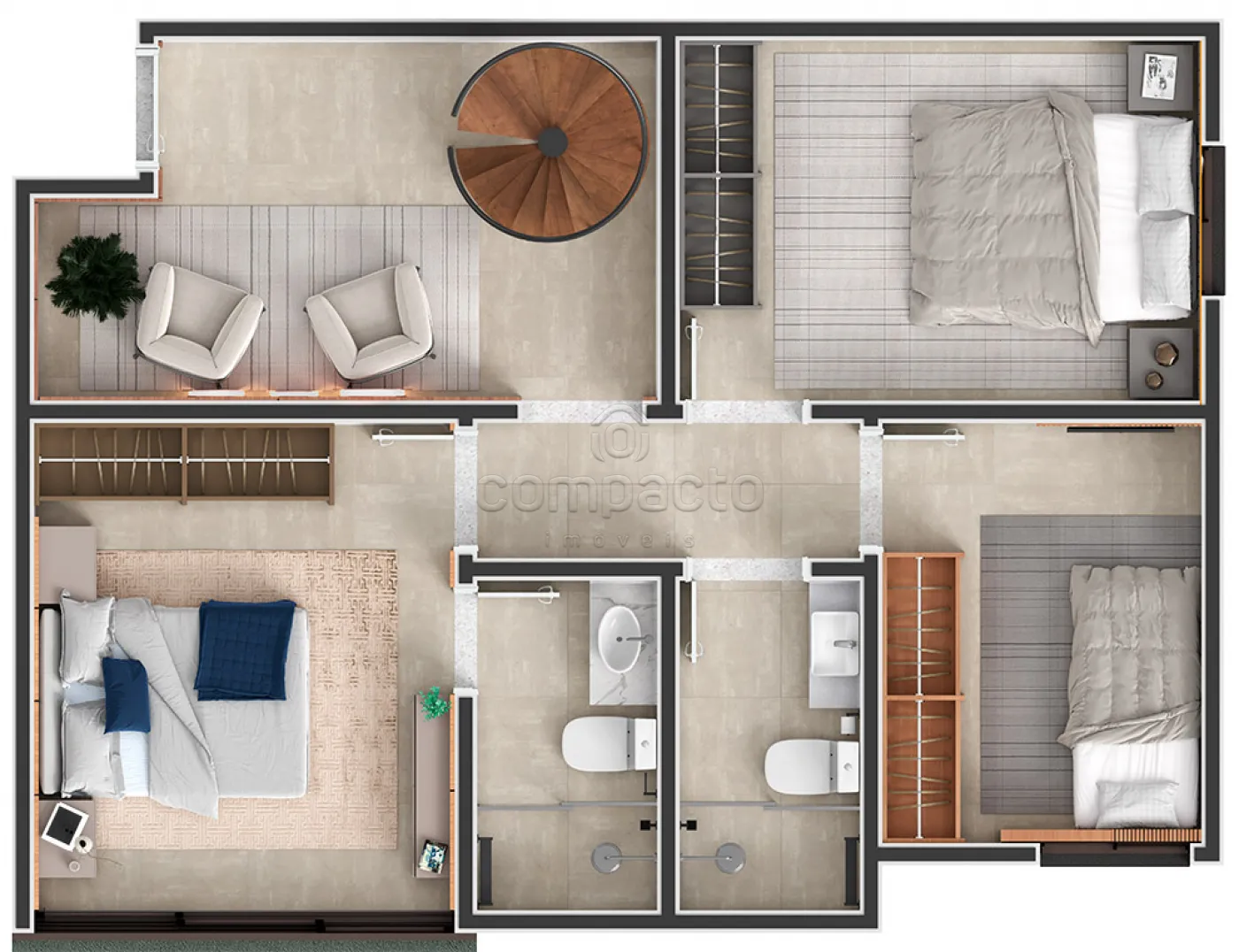Dúplex com 94m², com 1 Suítes, e mais 2 Dormitórios, os quartos ficam no andar inferior, e no superior fica a Sala, Lavabo, Cozinha, Lavanderia e Sacada.