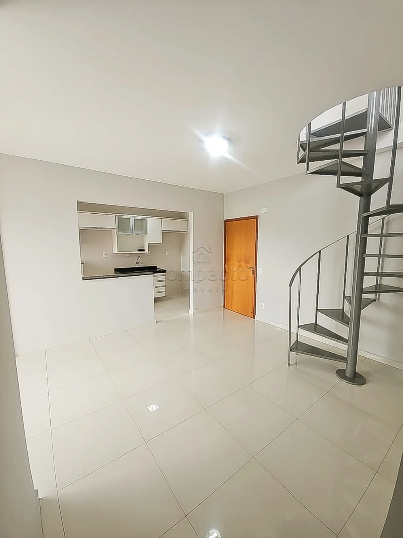 Acabamento em porcelanato, escada de acesso ao piso superior.