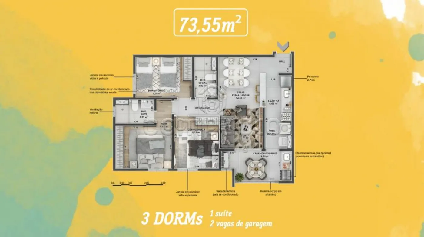 Apartamento com 3 dormitórios sendo 1 suíte, sala 2 ambientes, sacada, WC social, cozinha e área de serviço.