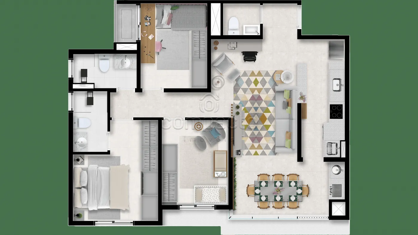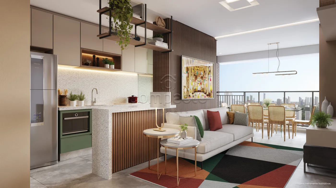 Apartamento com 3 Dormitórios, sendo 1 suíte, WC social, Lavabo, Cozinha tipo americana e Sala 2 ambientes.