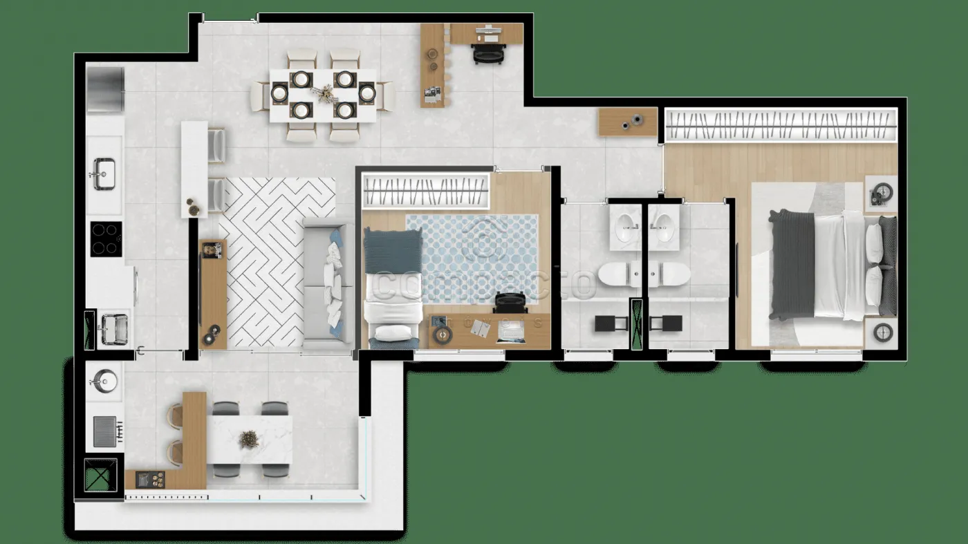 Apartamento com 2 Dormitórios, sendo 1 suíte, WC social, Cozinha tipo americana, Sala 2 ambientes e Varanda Gourmet.