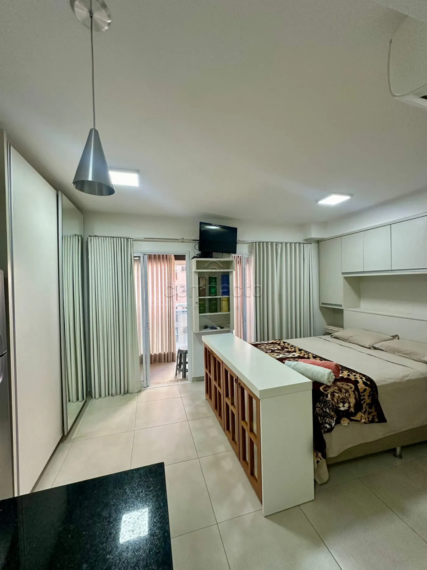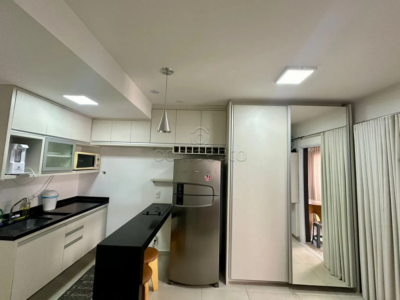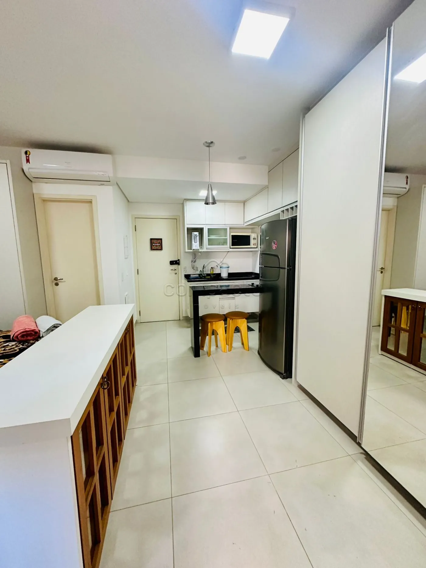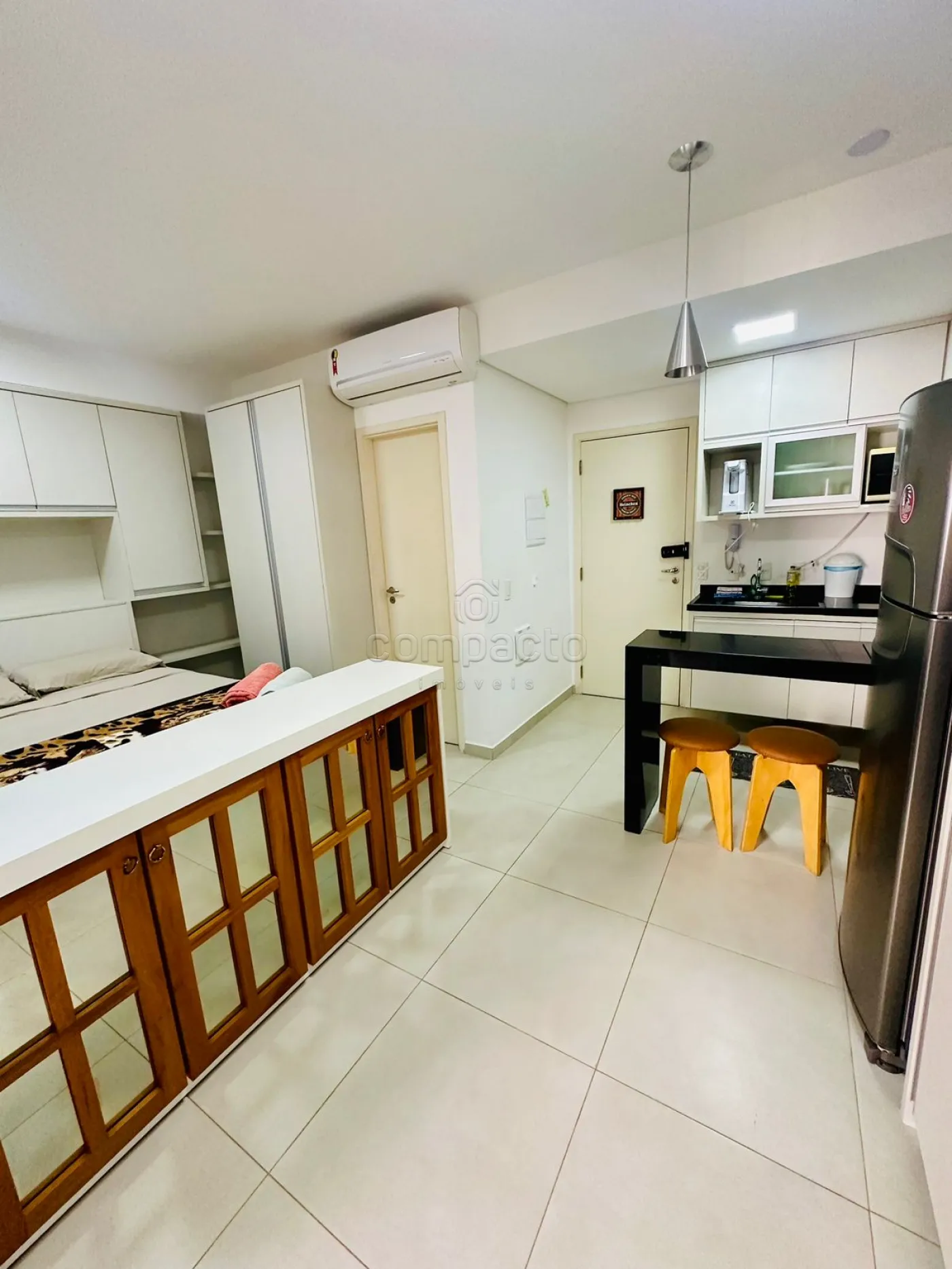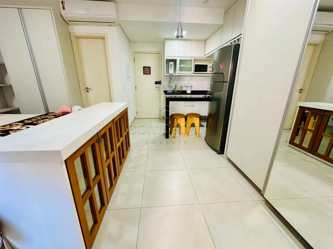 Apartamento Studio mobiliado com 1 Dormitório, Sala com Sacada, Cozinha Planejada e WC Social.