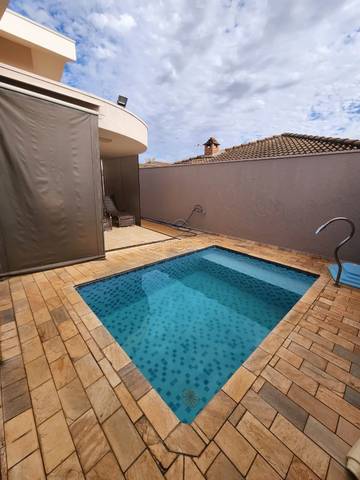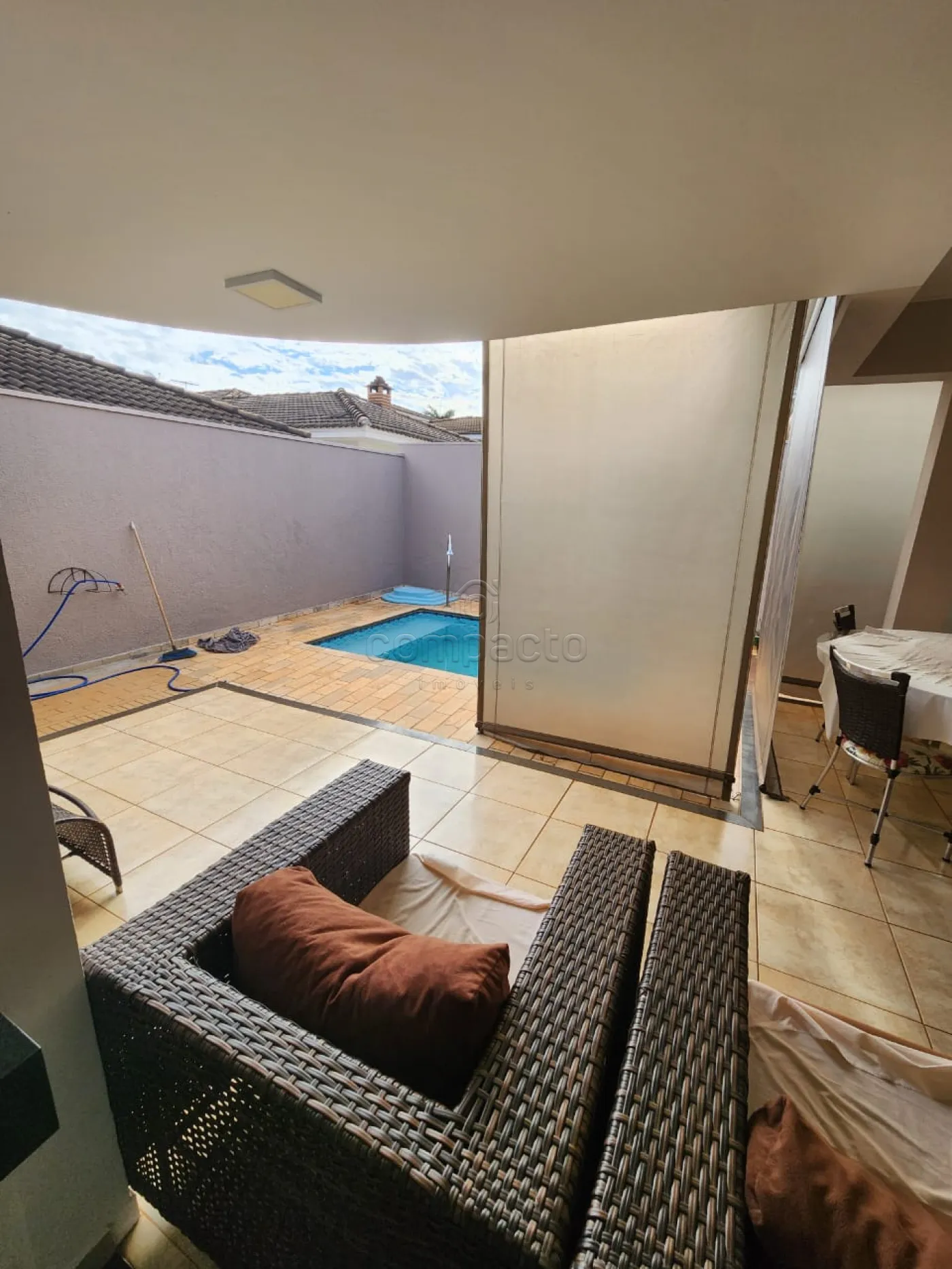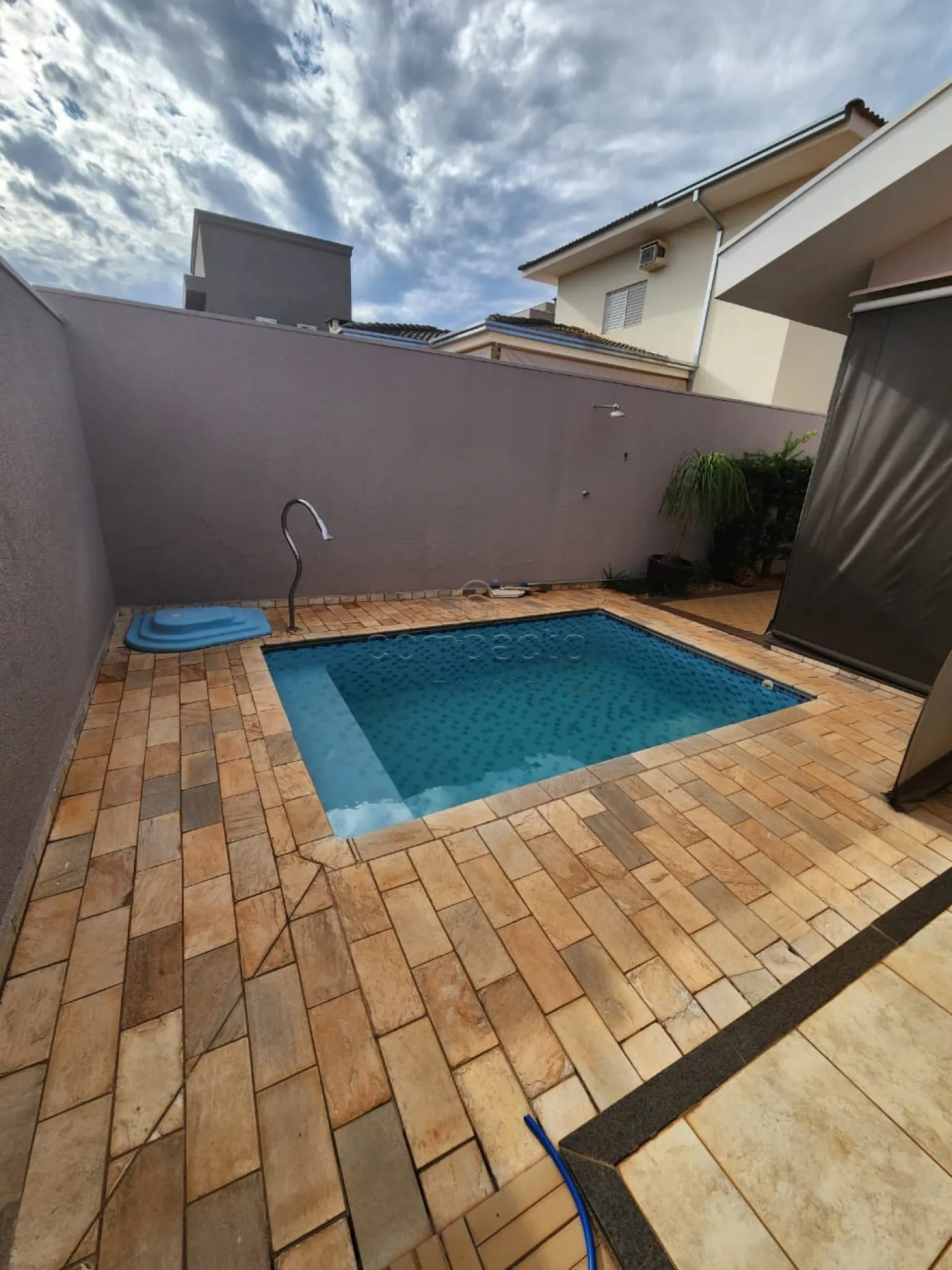 Casa térrea com 3 quartos tipo apartamento, sala, cozinha, churrasqueira, piscina e área de serviço.