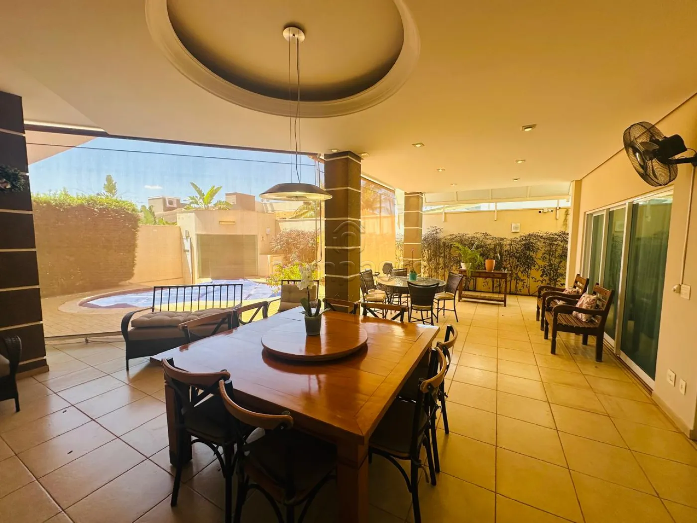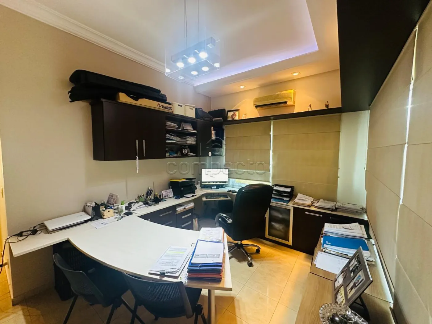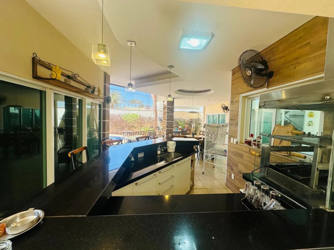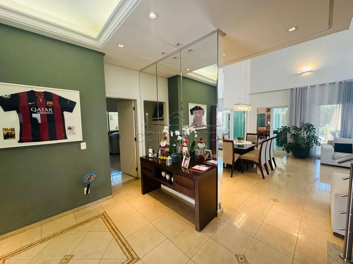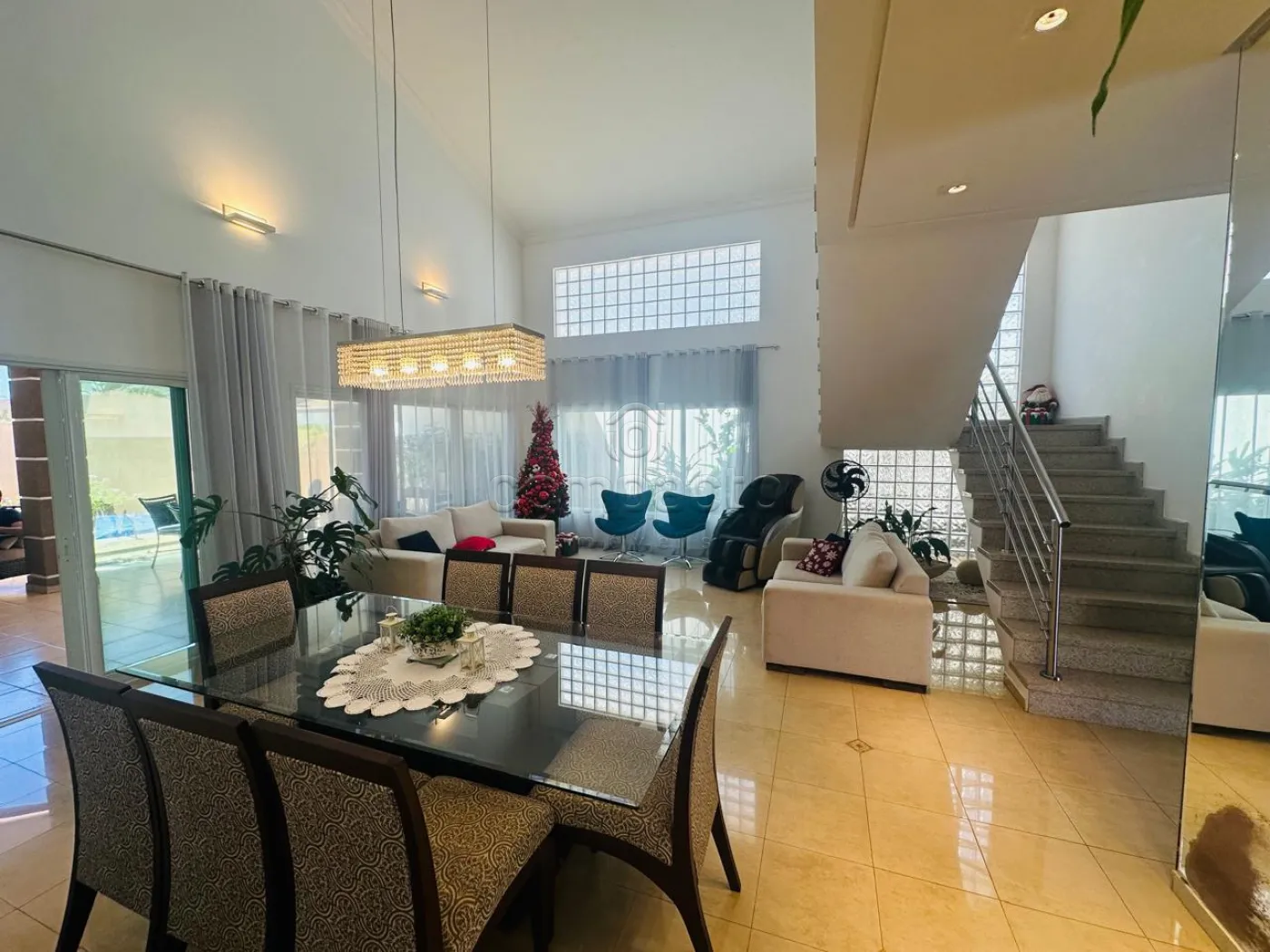 Sobrado com quatro dormitórios, sendo uma suíte máster com closet, hidromassagem, cuba e ducha dupla, além de varanda privativa; uma suíte com closet e varanda; e dois dormitórios estilo americano, ambos com closet e varanda. Conta ainda com sala íntima e copa. No piso inferior, há uma ampla sala para dois ambientes com pé-direito alto, dois escritórios climatizados com armários planejados, cozinha espaçosa e rica em armários com despensa, lavanderia ampla e dependência de funcionário com banheiro. A área de convivência inclui sala de TV integrada à varanda, ampla varanda com churrasqueira e balcão refrigerado, piscina aquecida com acesso à sauna, lavabo e banheiro para atender à área de lazer. O imóvel possui ainda energia fotovoltaica, sistema de aquecimento de água, garagem para até seis veículos, sendo três cobertos, e corredor lateral com acesso direto à área de lazer.