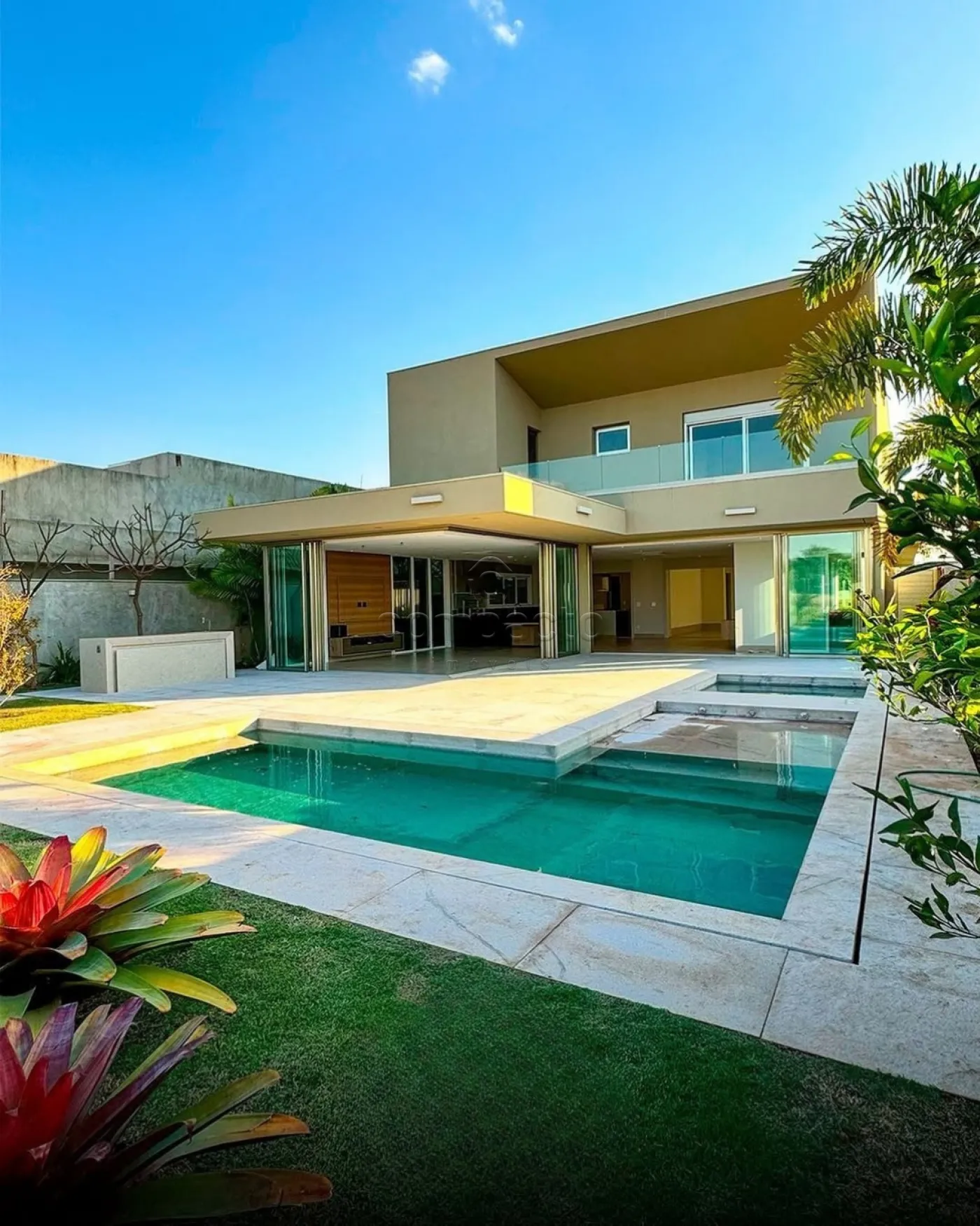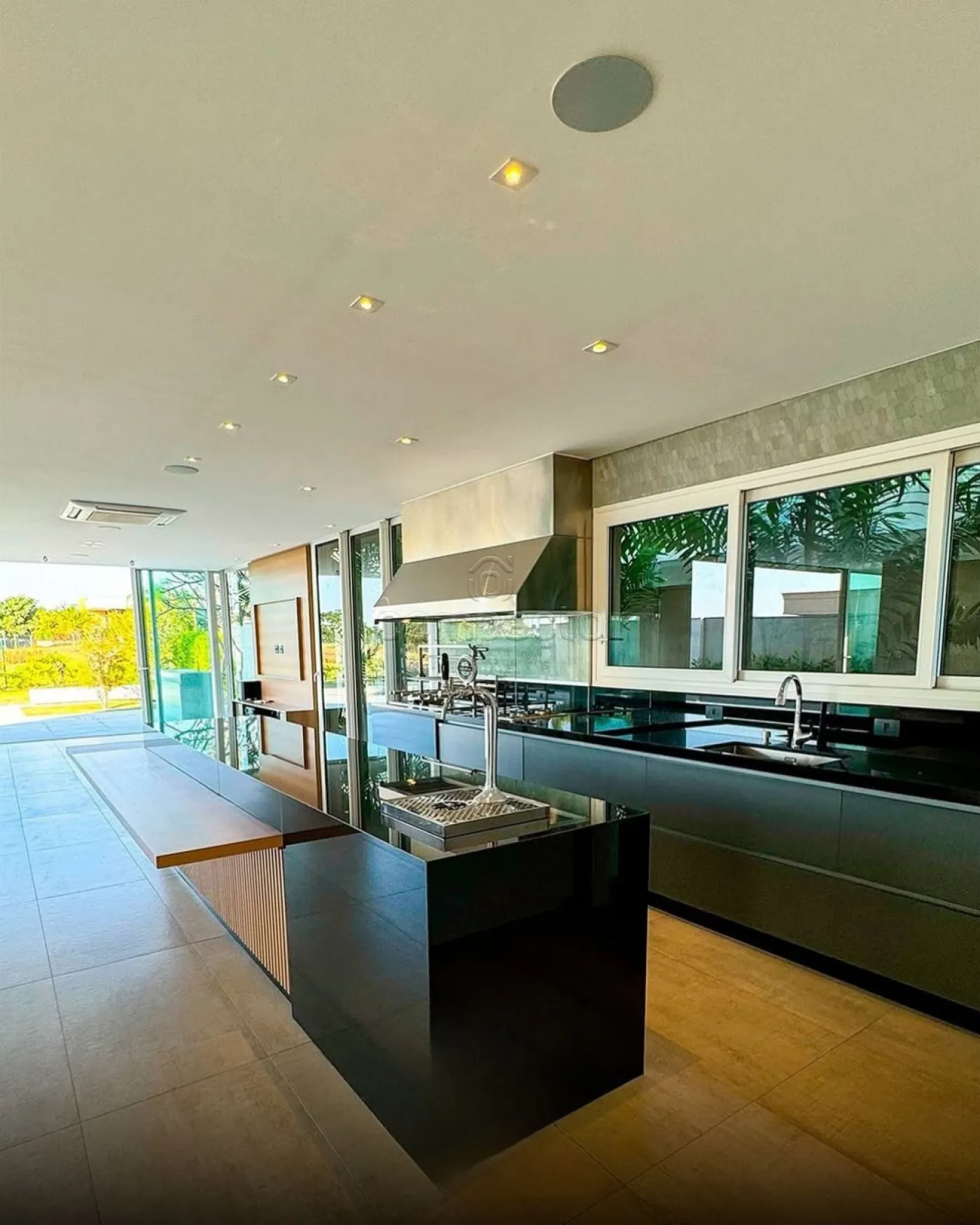Mansão de cinema com fundo para o campo de golfe, localizada em uma das áreas mais privilegiadas do condomínio. A residência impressiona pelo acabamento primoroso e de alto padrão em cada detalhe. Possui 5 suítes, 7 banheiros, lavabo, elevador e uma ampla sala com três ambientes. Conta ainda com home cinema, escritório planejado e projeto impecável de iluminação e móveis sob medida. A varanda gourmet é integrada à cozinha e equipada com churrasqueira, perfeita para receber. A área de lazer é ampla e conta com uma bela piscina. Dispõe também de área de serviço e garagem para quatro carros.