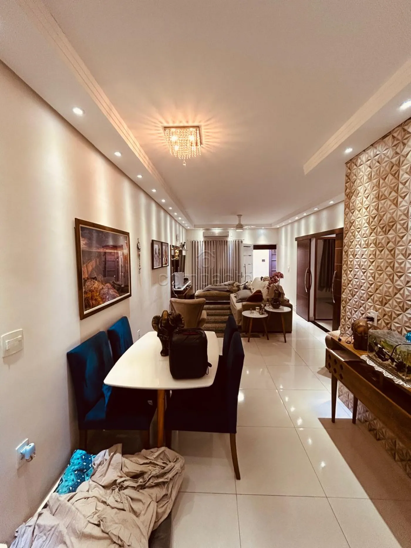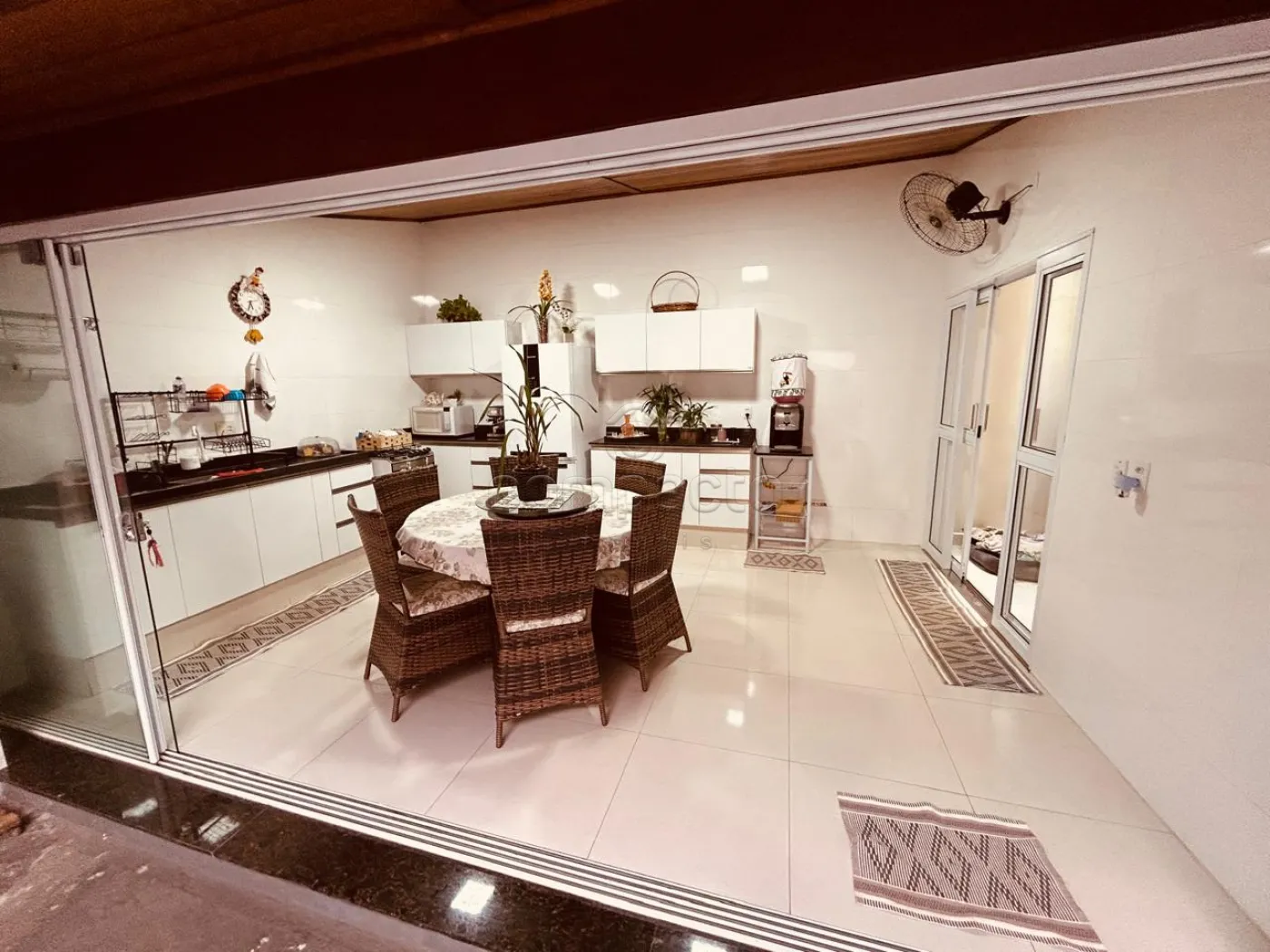 Casa com três dormitórios, todos com ar-condicionado, dois banheiros, sala ampla para dois ambientes e cozinha planejada. Conta ainda com espaço gourmet equipado com churrasqueira, lavanderia e garagem para até quatro carros. O imóvel possui energia fotovoltaica, sistema de alarme, cerca elétrica conectada à internet com monitoramento pelo celular e câmeras de segurança.