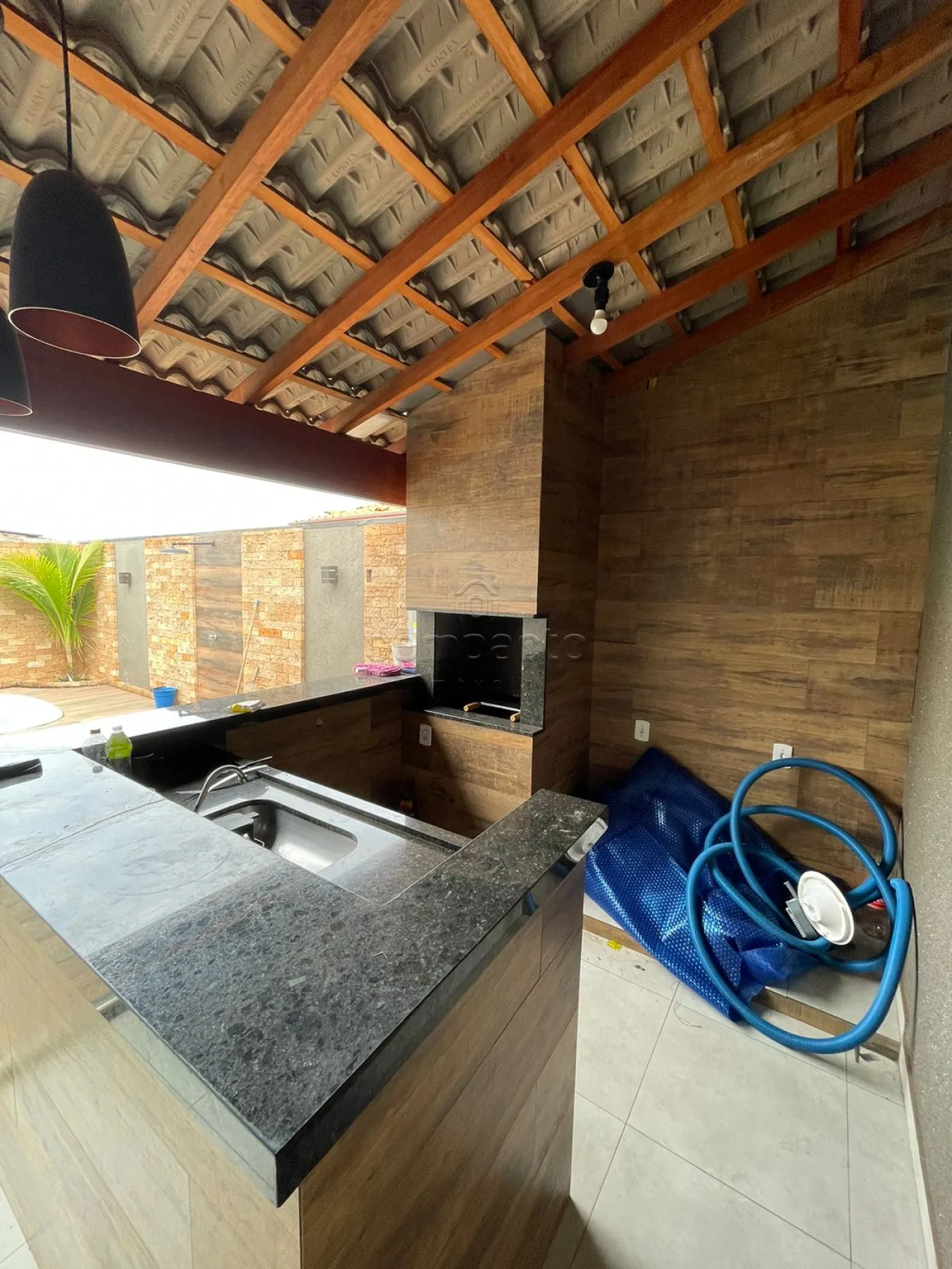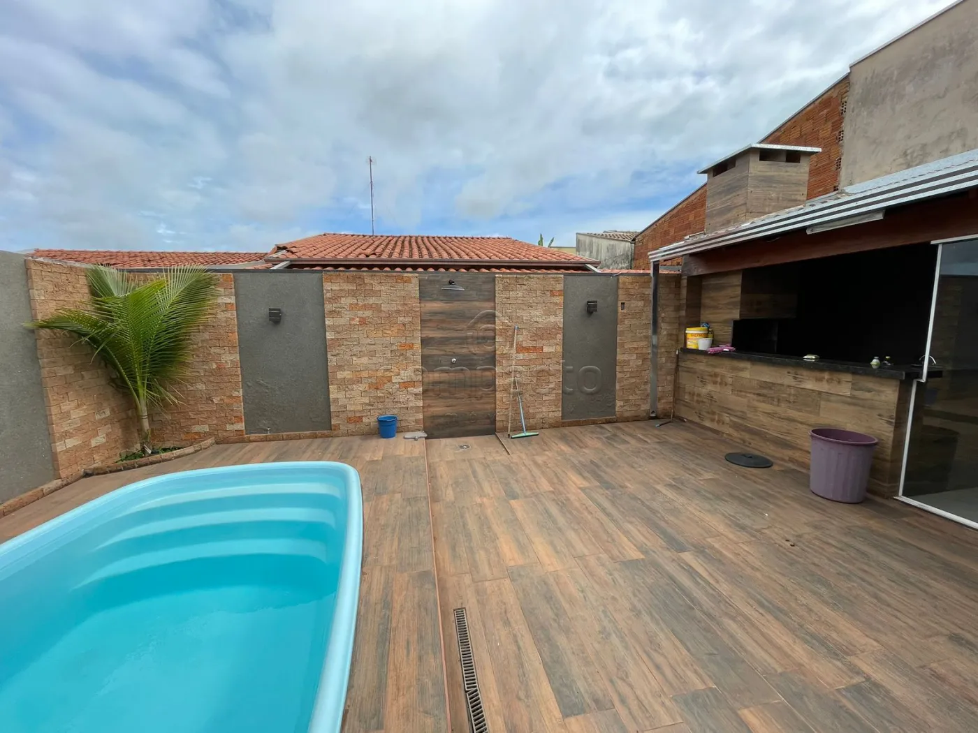 Casa com 2 dormitórios (sendo 1 suíte), sala, wc social, cozinha com armários, varanda com churrasqueira e piscina aquecida.