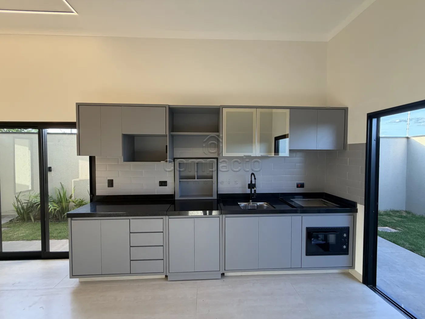 Cozinha planejada com bancada preta e área gourmet;