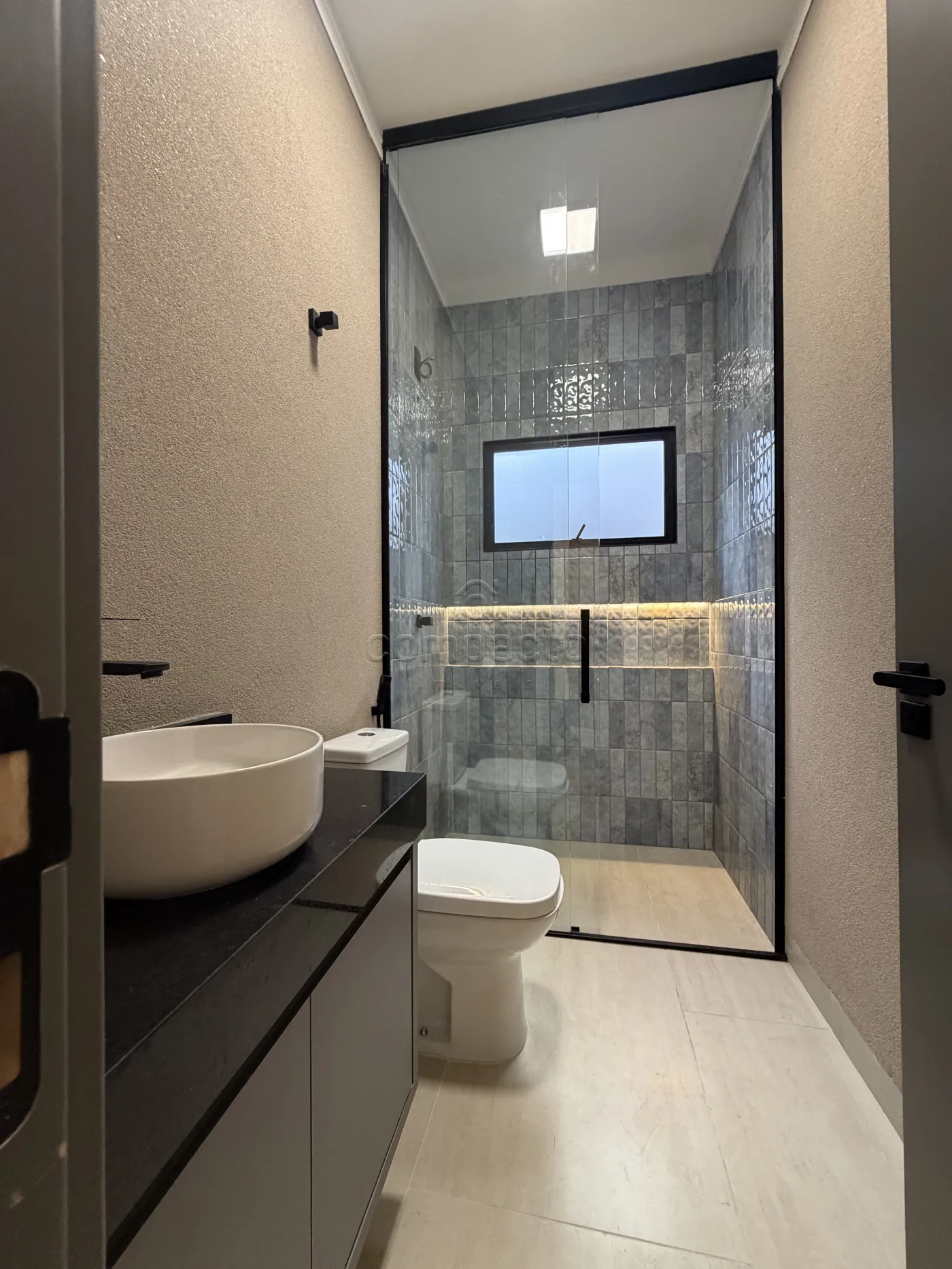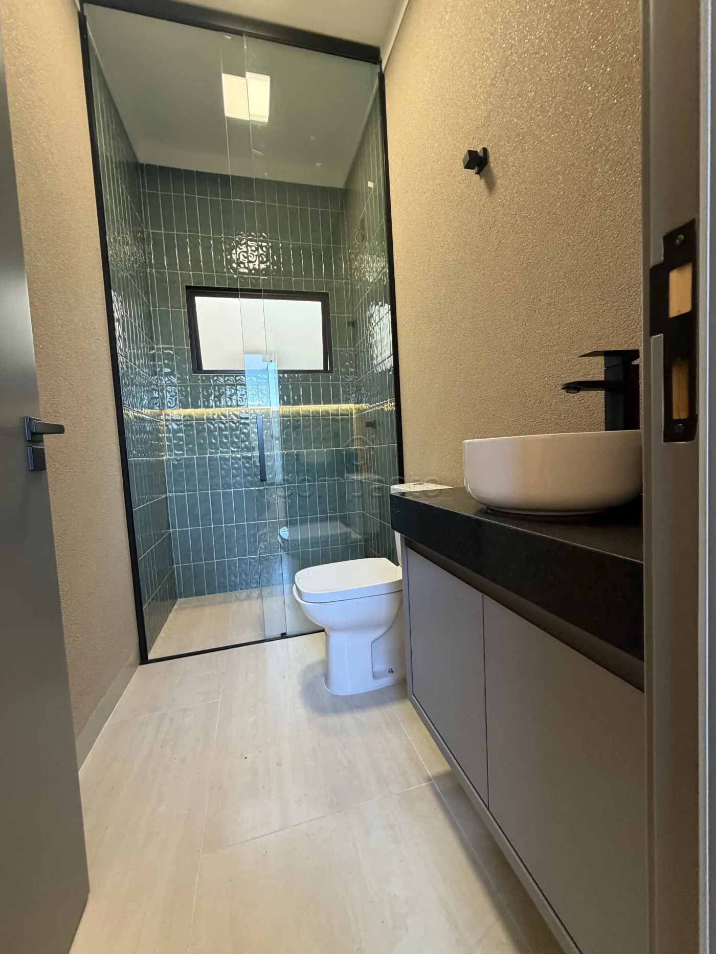 Banheiro social com revestimento de alto padrão;