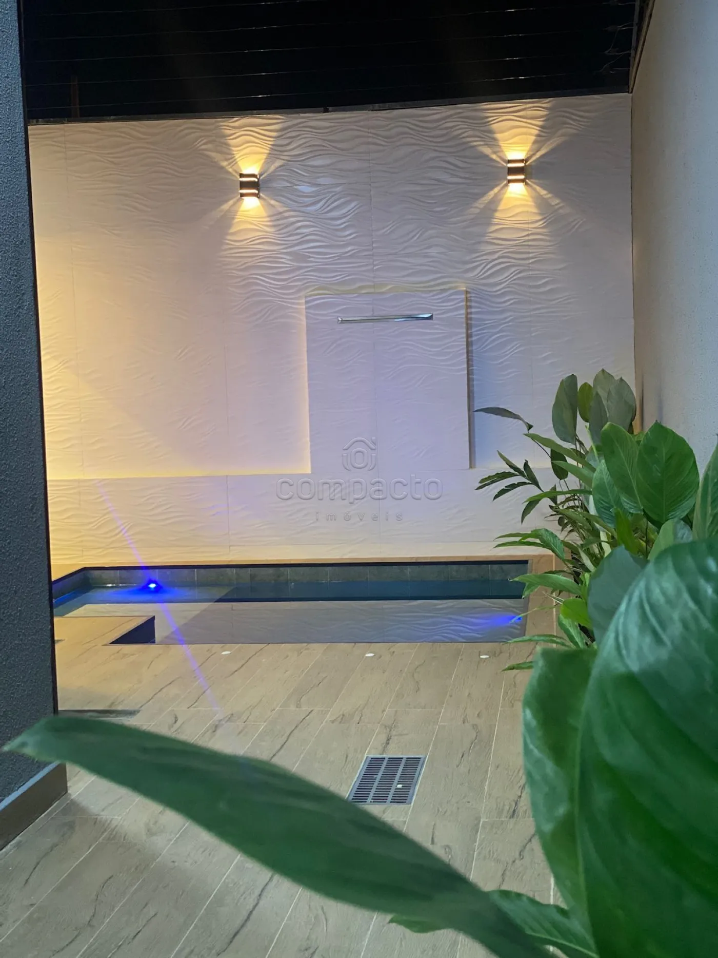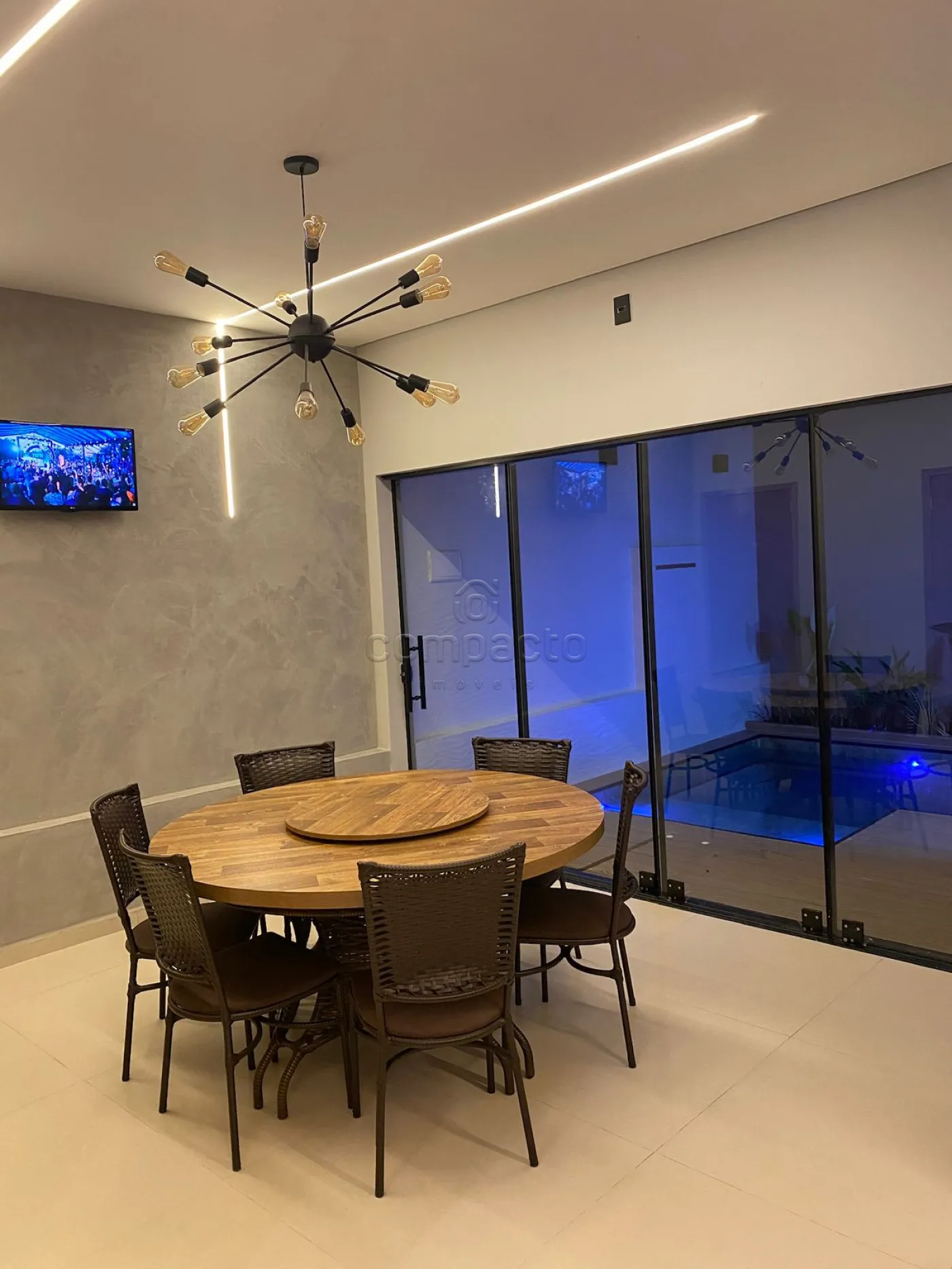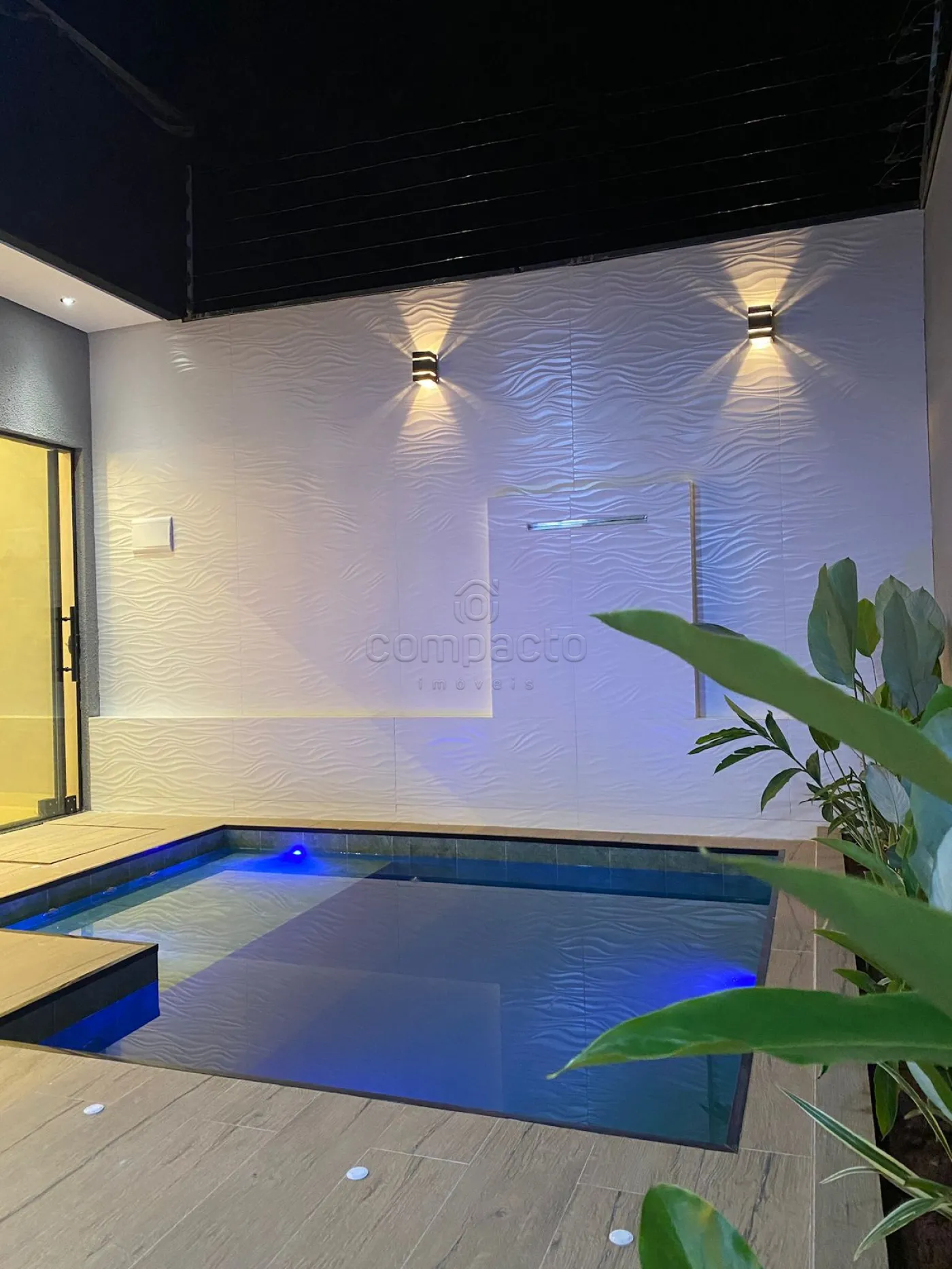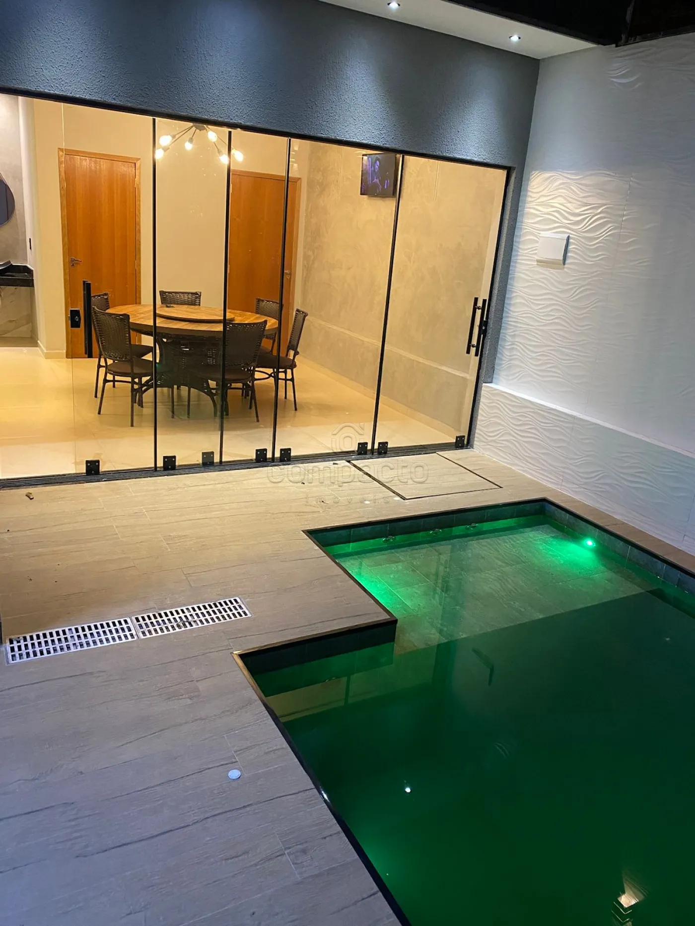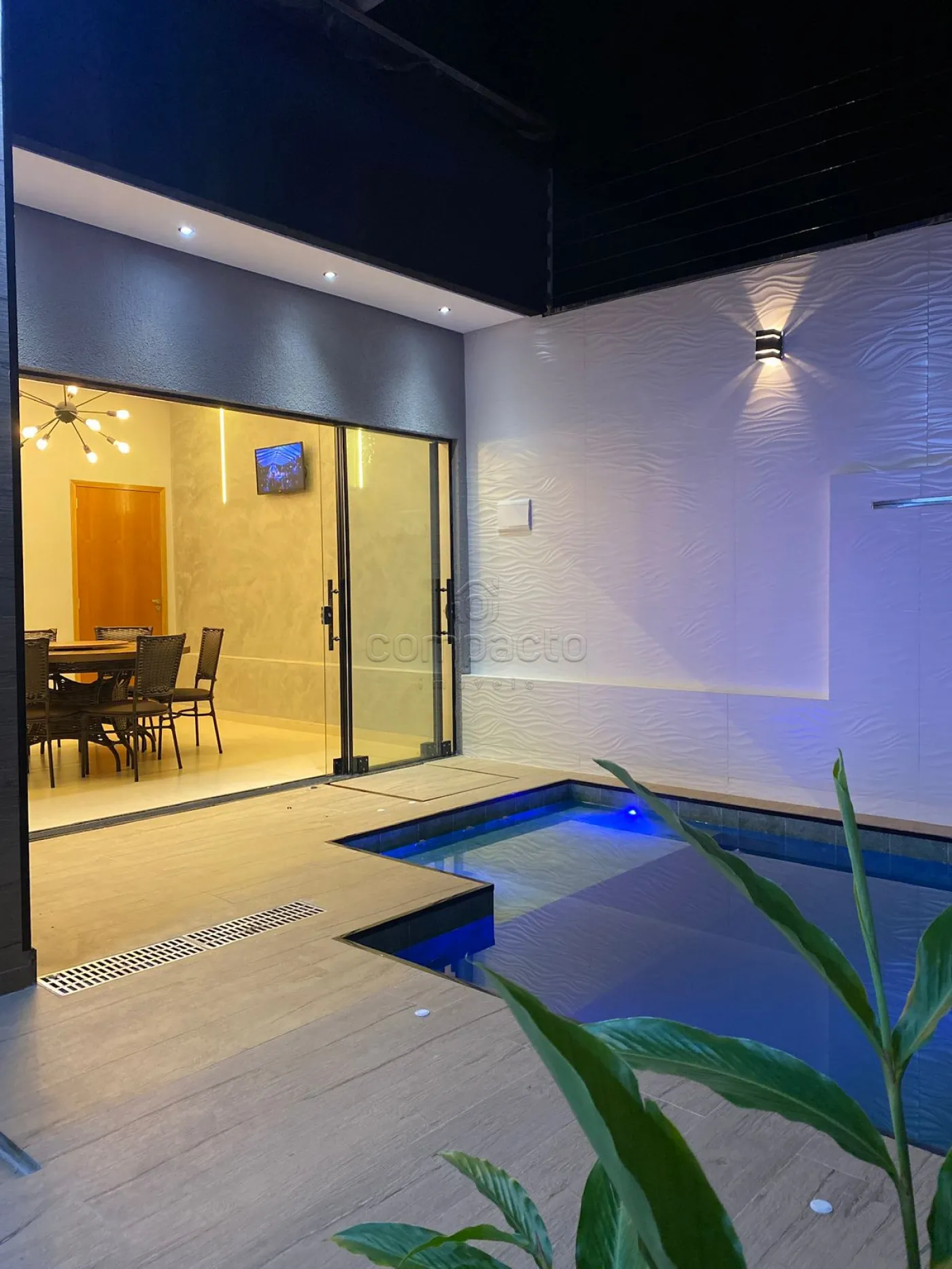 Casa com dois quartos, sendo um deles suíte com guarda-roupa embutido, além de três banheiros equipados com armários planejados. A sala possui pé-direito alto, parede em 3D, painel com porta de correr e uma ampla janela de dois metros e meio. A cozinha é completa, com armários embutidos, churrasqueira, forno, cooktop, micro-ondas e coifa. Na área externa, há piscina com aquecedor, iluminação e cascata, além de um espaço gourmet integrado. O imóvel dispõe ainda de garagem para dois carros.