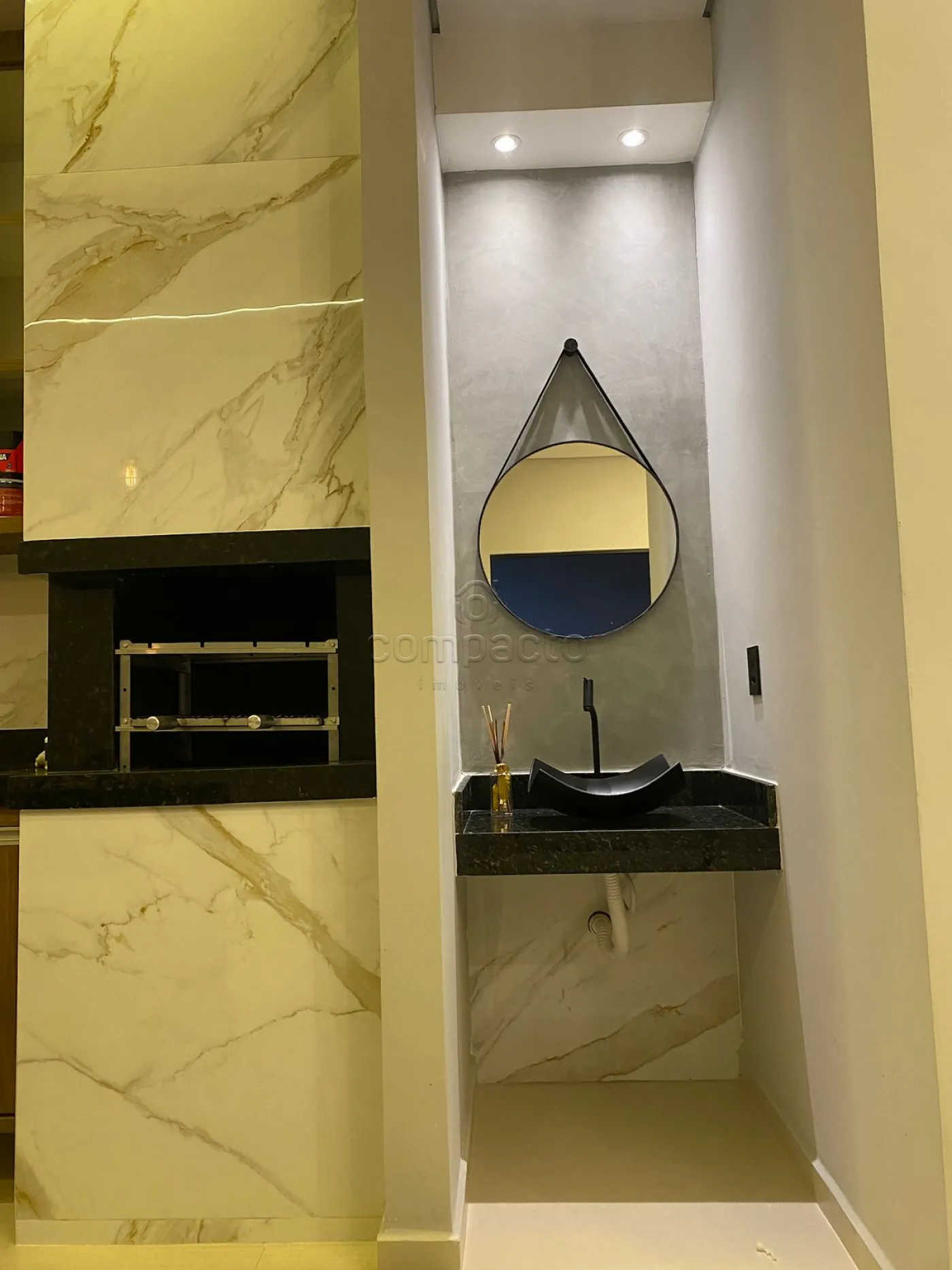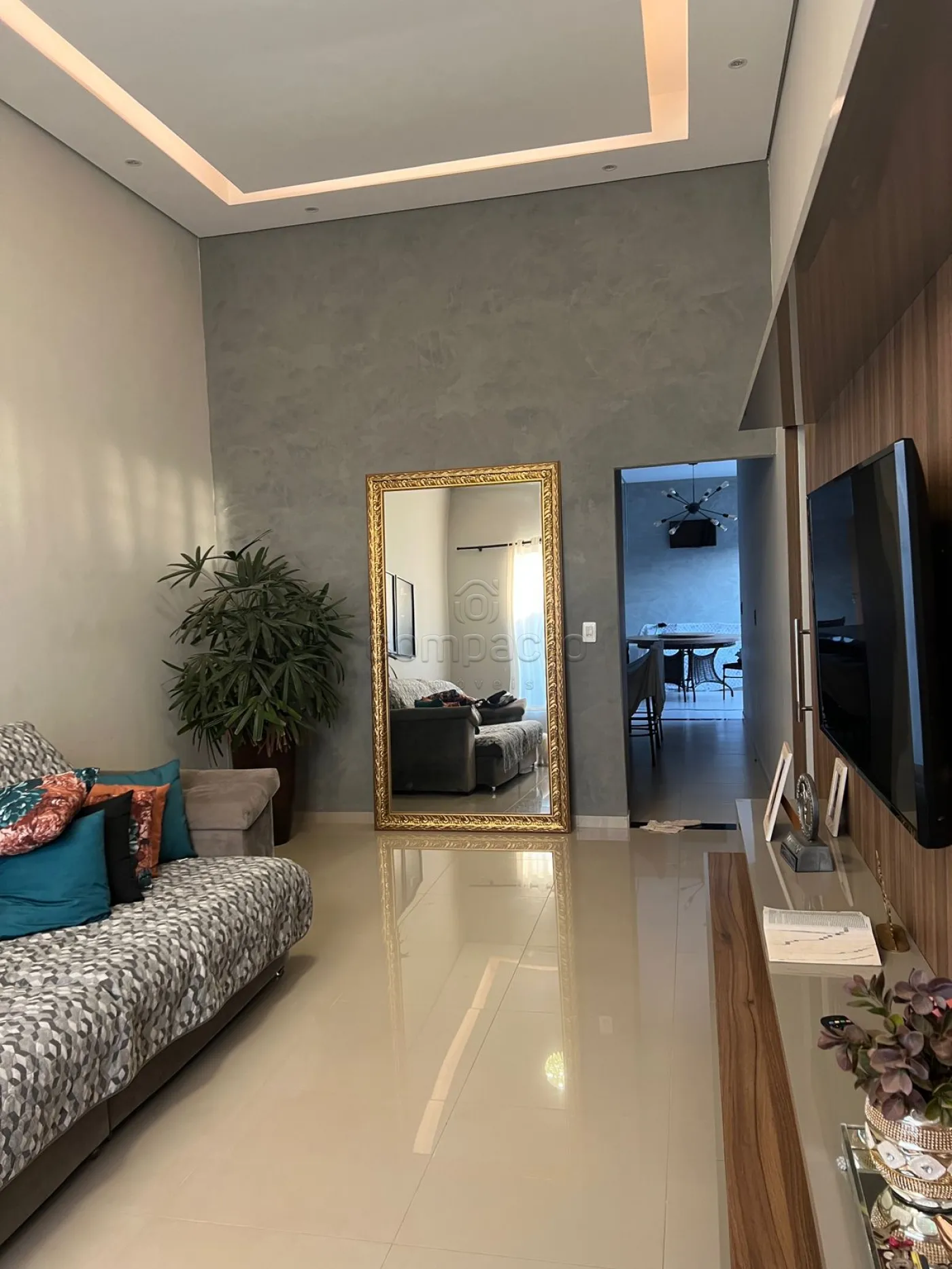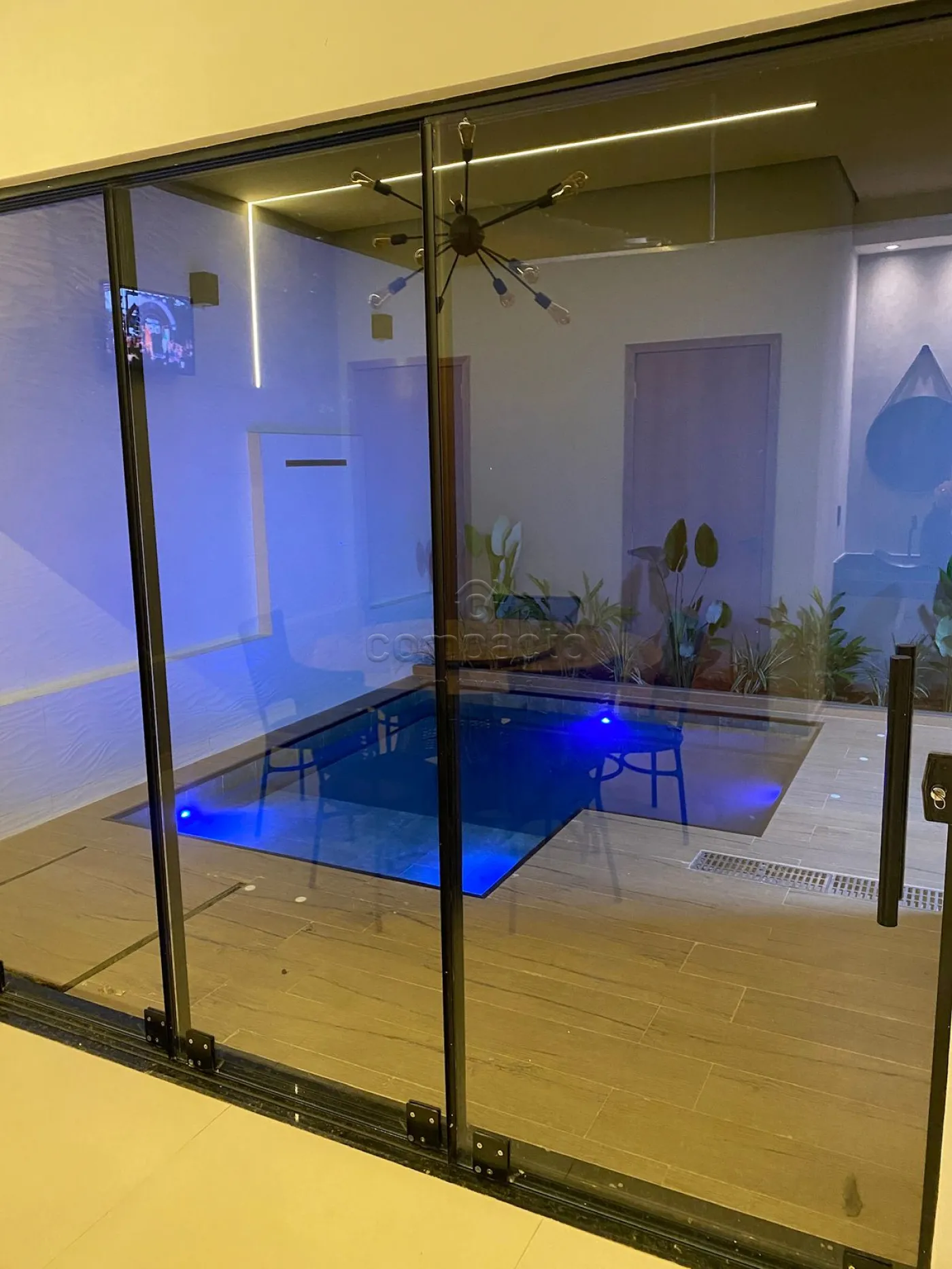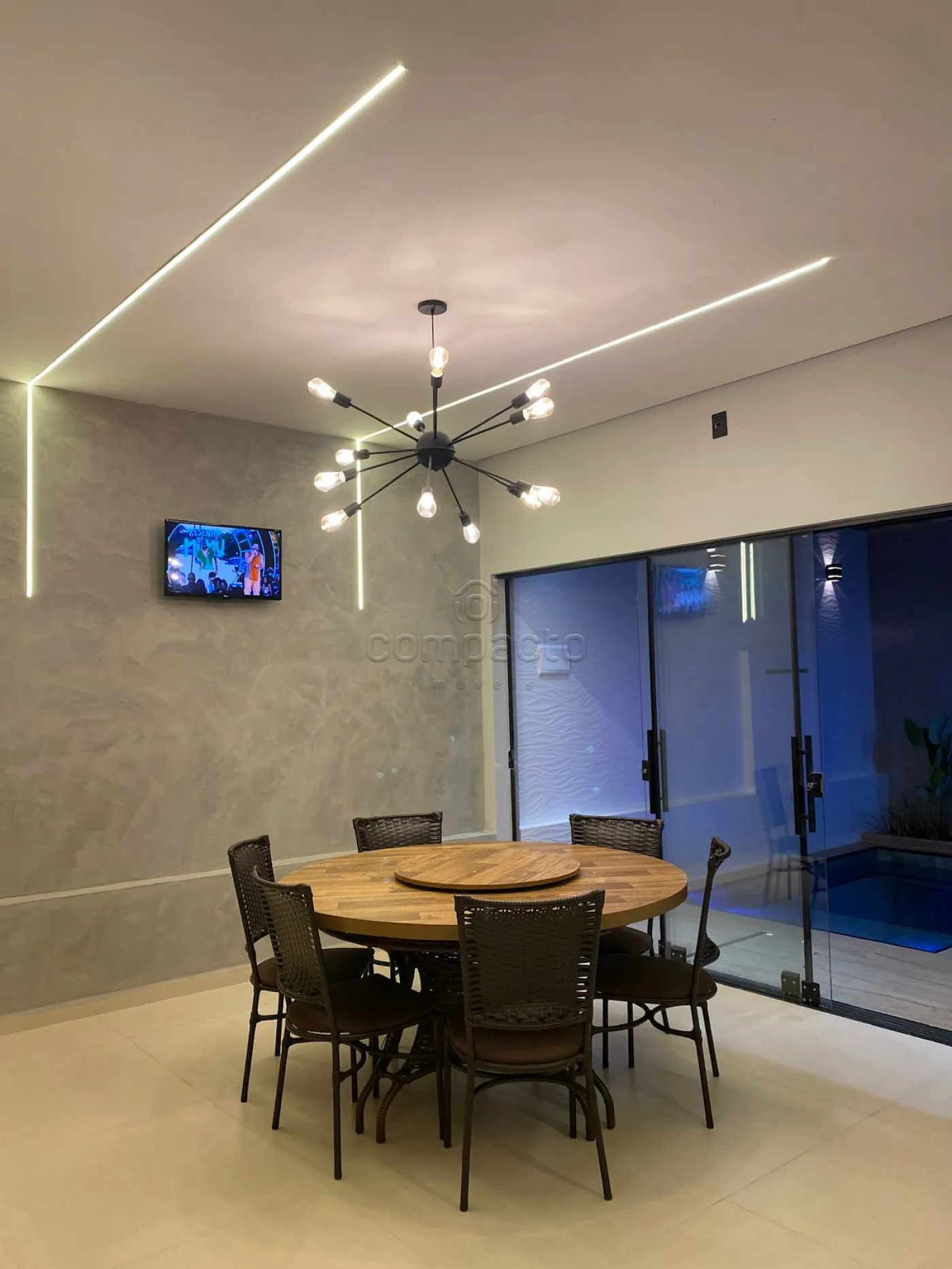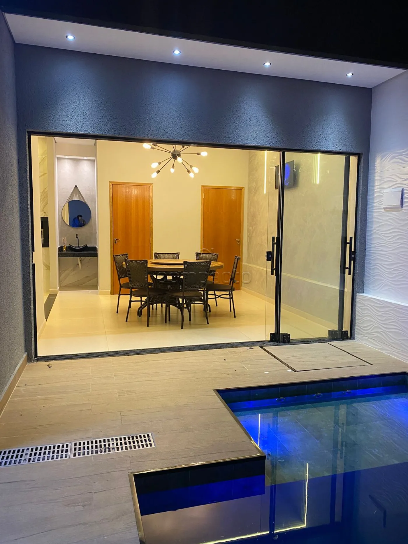 Casa com dois quartos, sendo um deles suíte com guarda-roupa embutido, além de três banheiros equipados com armários planejados. A sala possui pé-direito alto, parede em 3D, painel com porta de correr e uma ampla janela de dois metros e meio. A cozinha é completa, com armários embutidos, churrasqueira, forno, cooktop, micro-ondas e coifa. Na área externa, há piscina com aquecedor, iluminação e cascata, além de um espaço gourmet integrado. O imóvel dispõe ainda de garagem para dois carros.