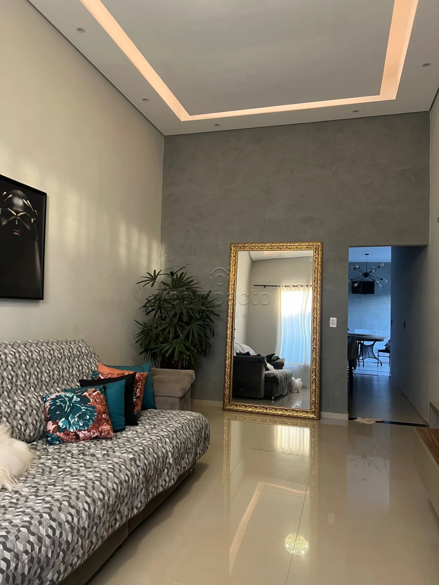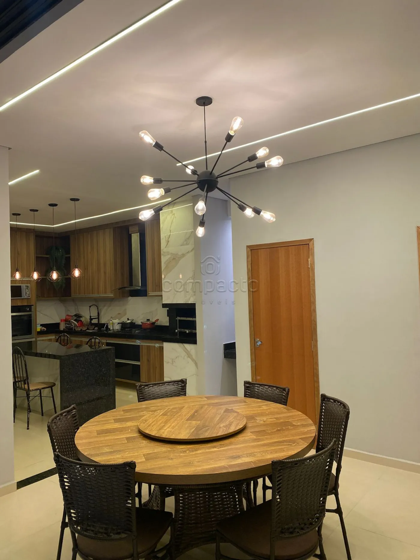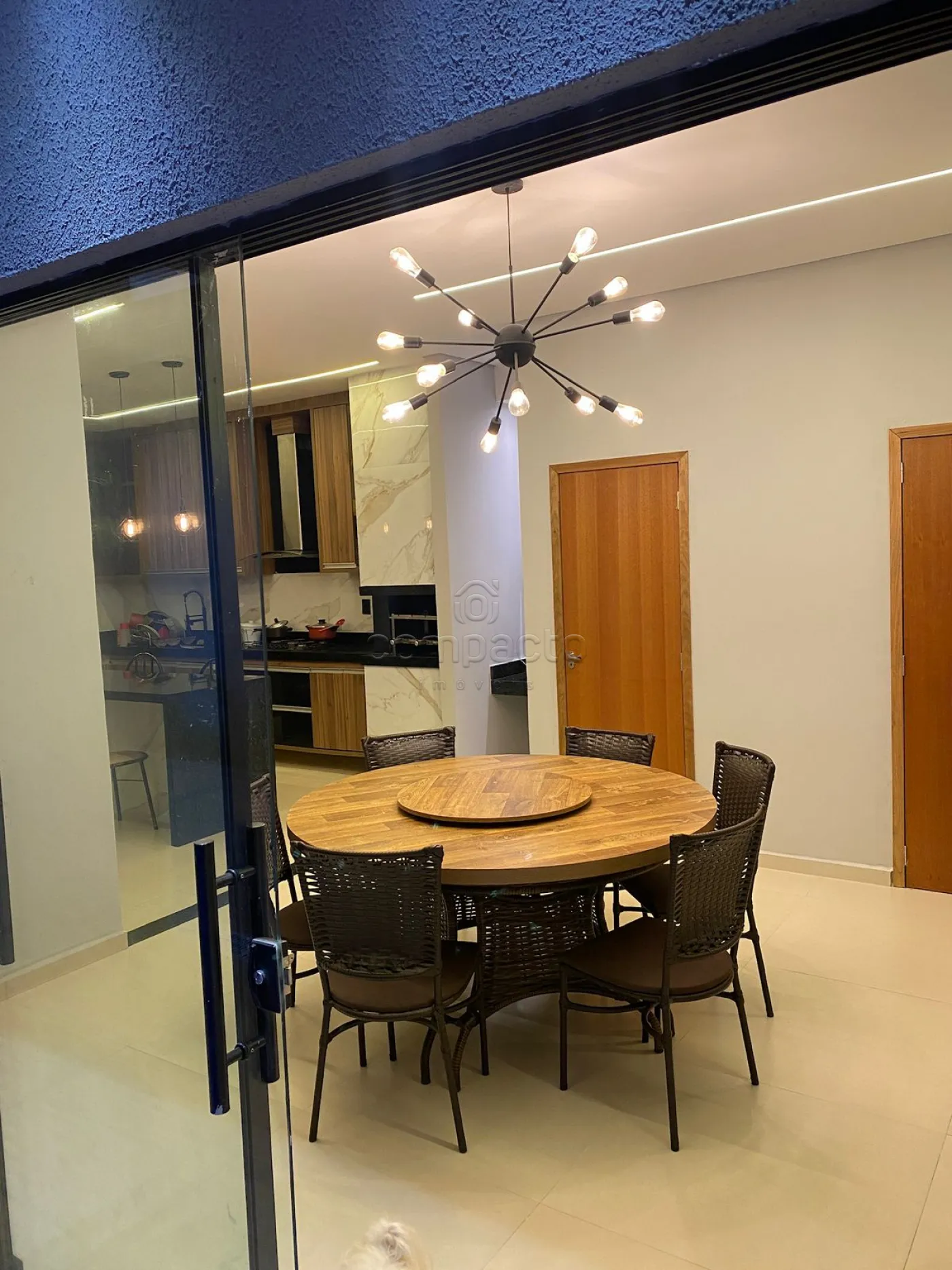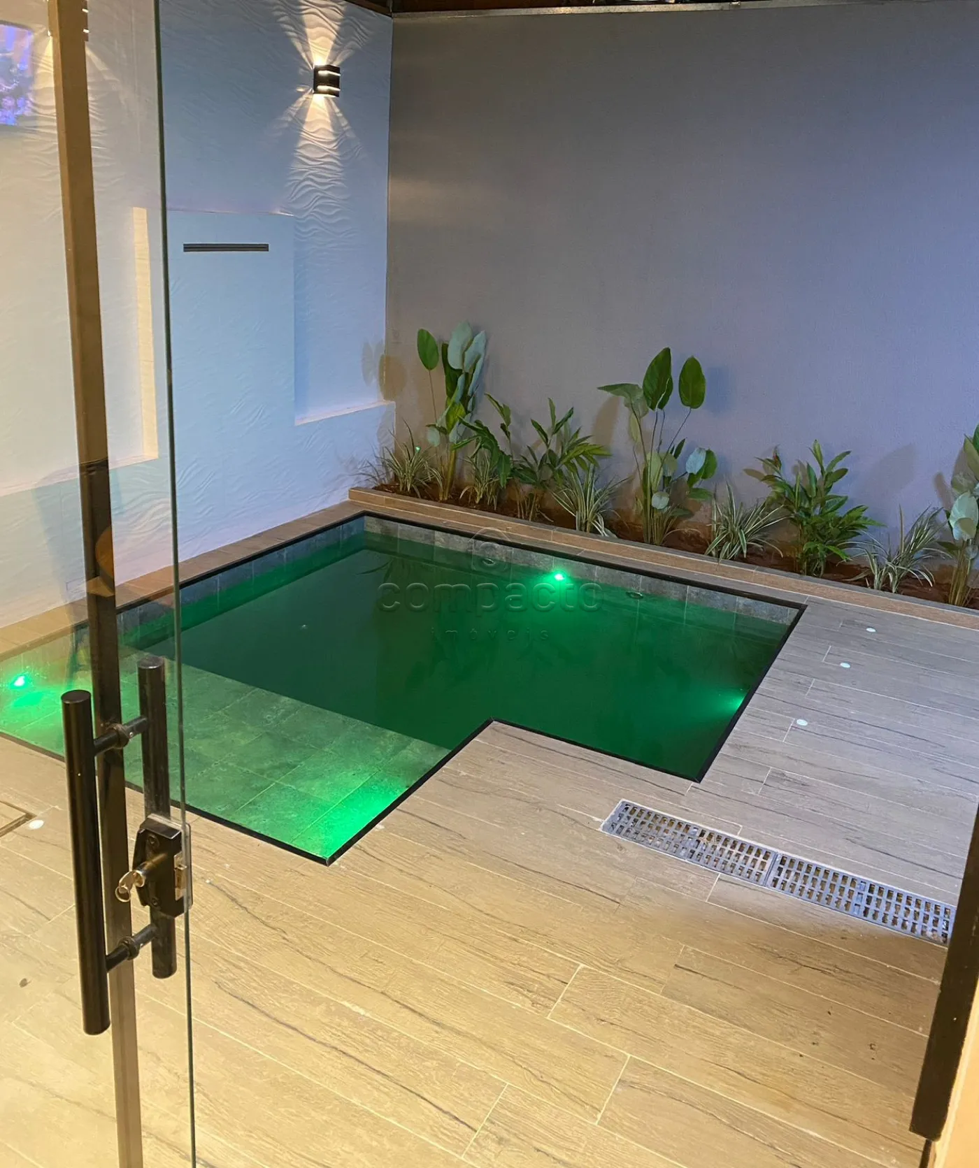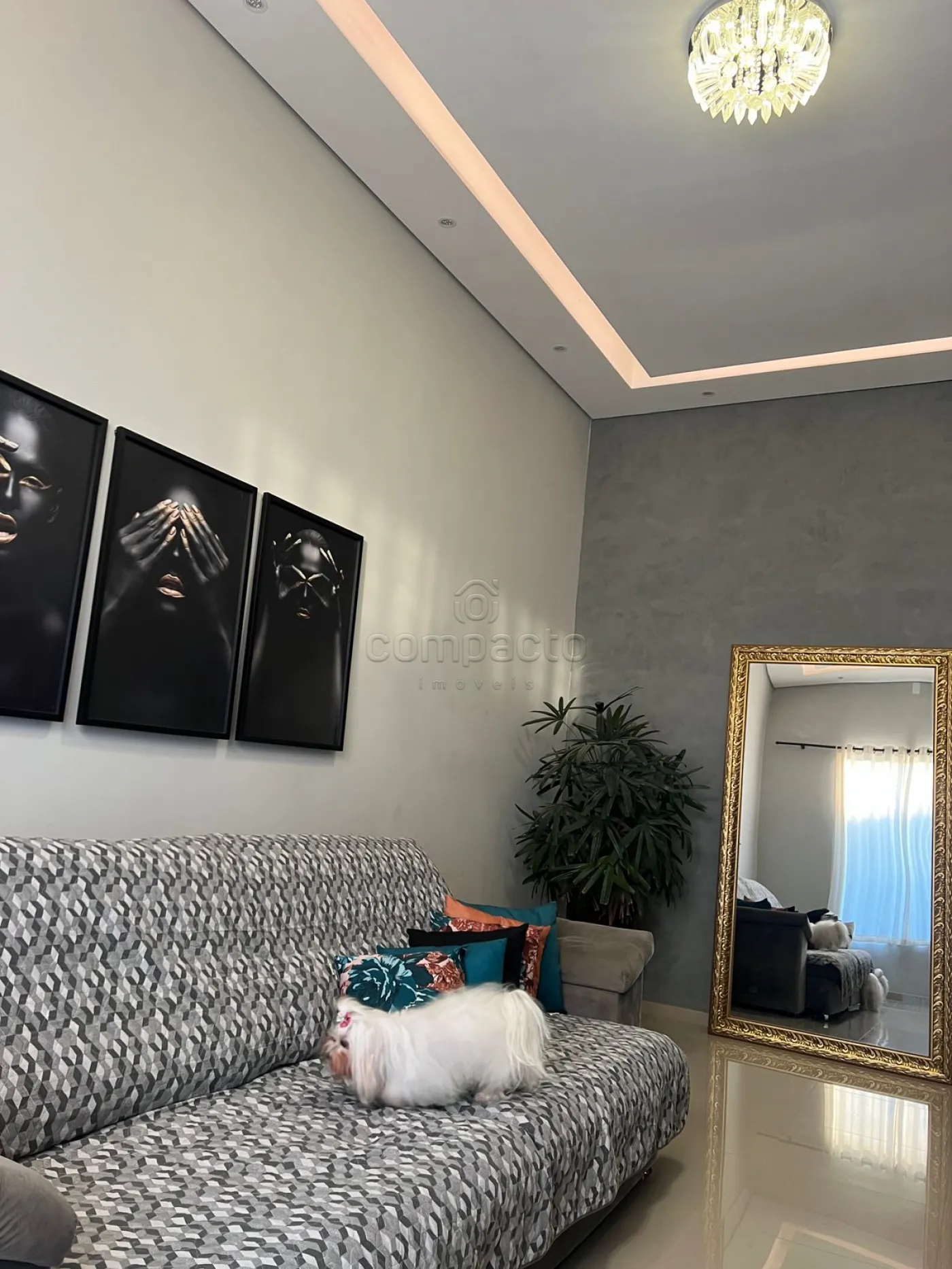 Casa com dois quartos, sendo um deles suíte com guarda-roupa embutido, além de três banheiros equipados com armários planejados. A sala possui pé-direito alto, parede em 3D, painel com porta de correr e uma ampla janela de dois metros e meio. A cozinha é completa, com armários embutidos, churrasqueira, forno, cooktop, micro-ondas e coifa. Na área externa, há piscina com aquecedor, iluminação e cascata, além de um espaço gourmet integrado. O imóvel dispõe ainda de garagem para dois carros.