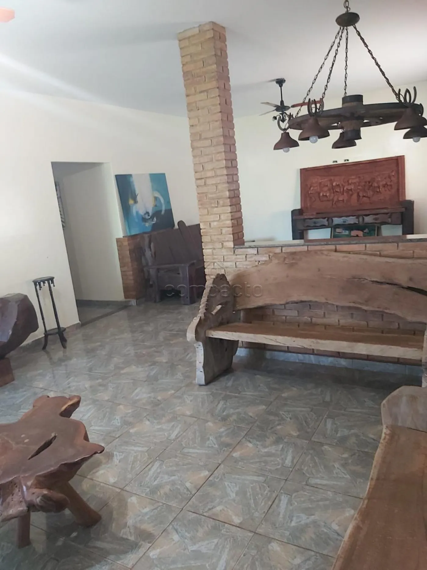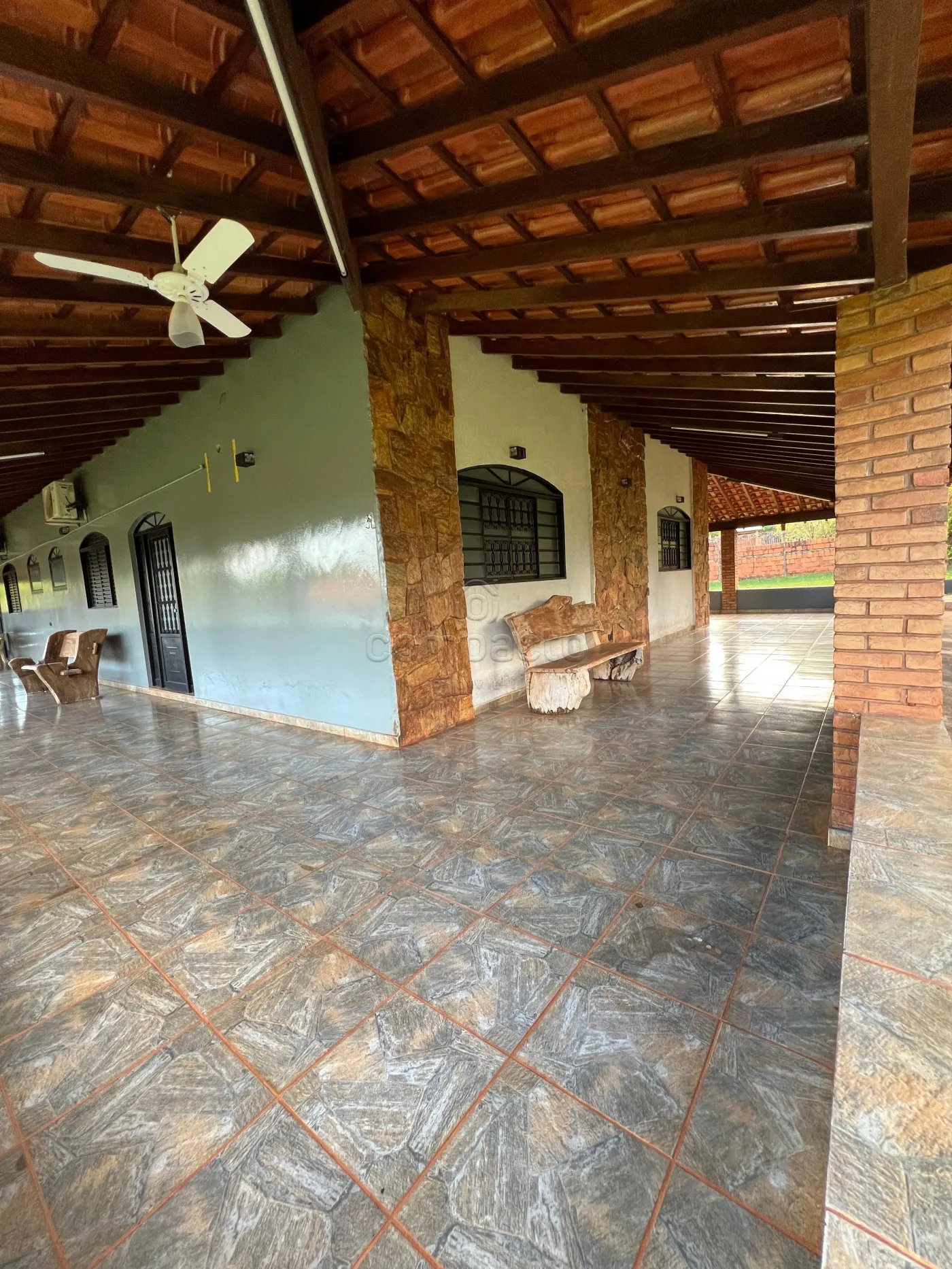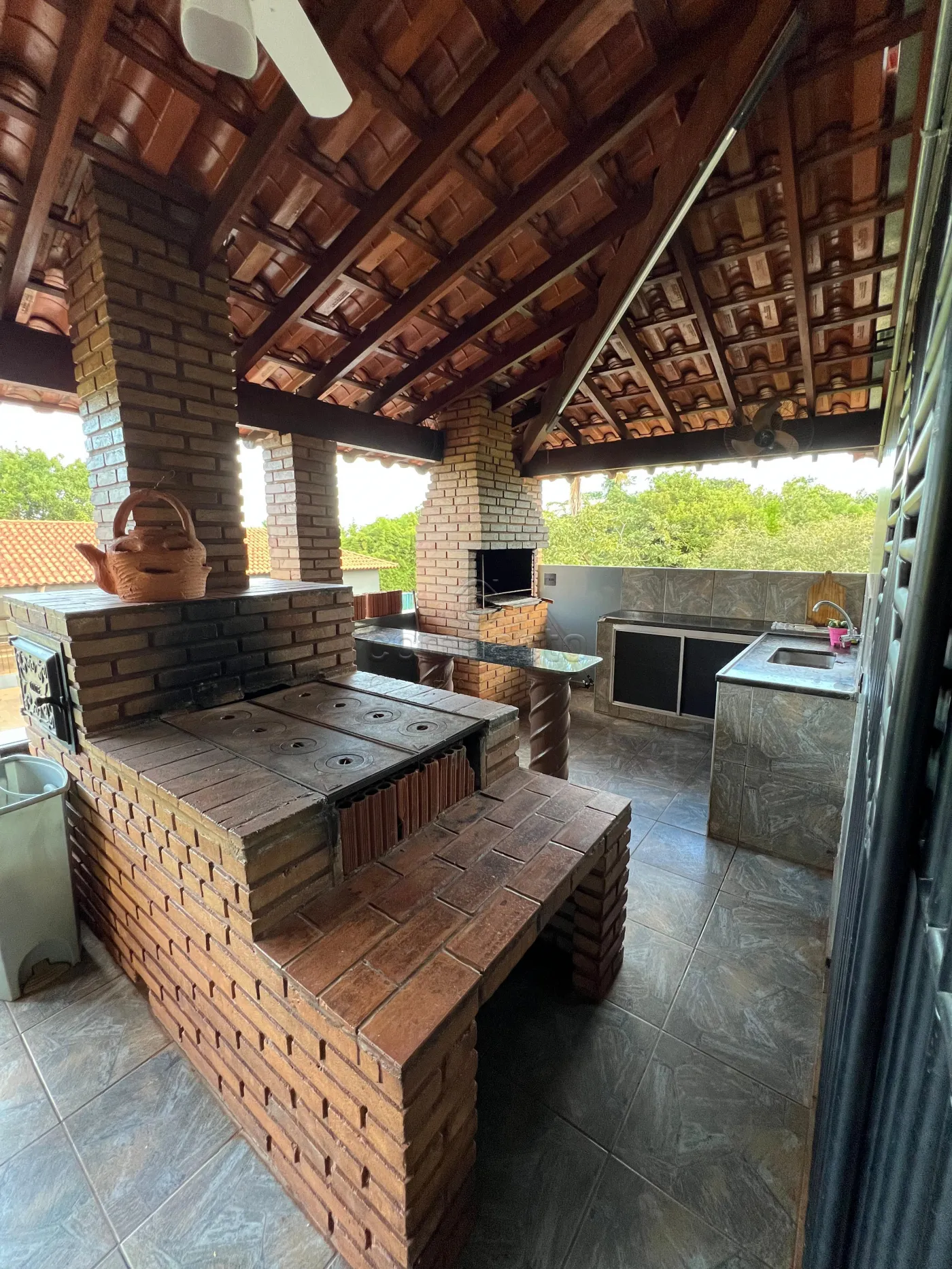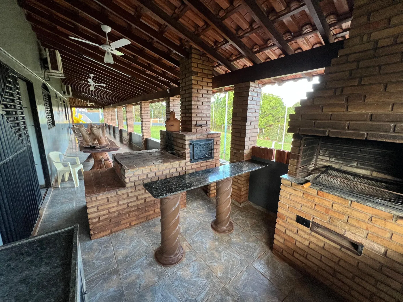 A casa principal mede 23 x 16 m e dispõe de sala ampla, três suítes com ar-condicionado, cozinha, lavanderia, banheiro social, fogão a lenha, mesa em pedra e balcão com pia.