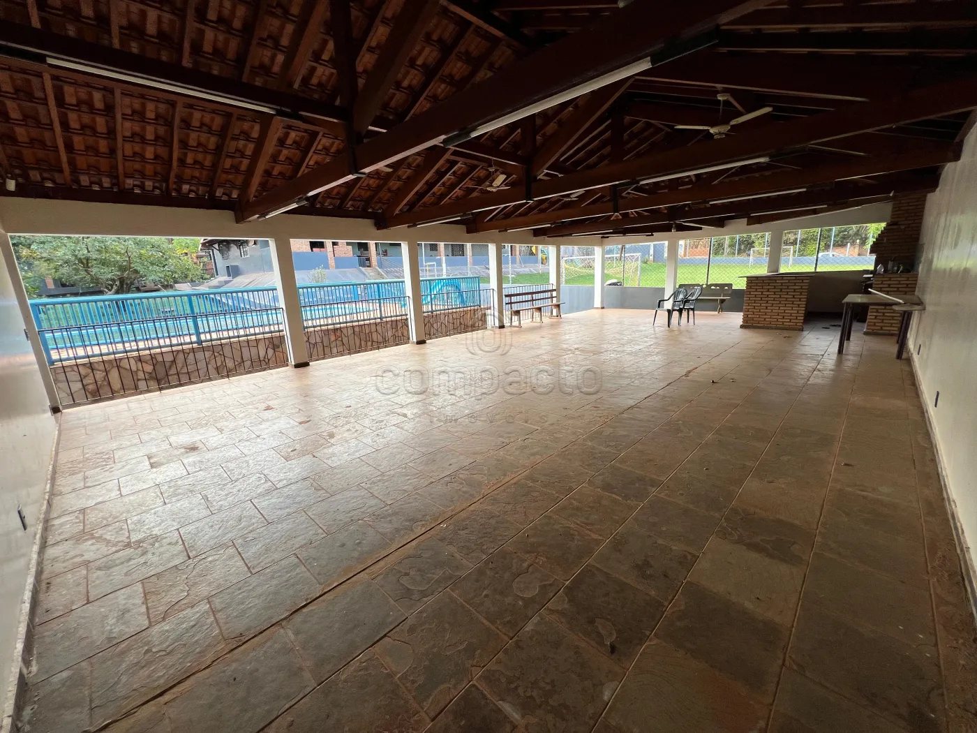 Há também um salão de festas com 18,50 x 8 m, contendo dois banheiros, um quarto, balcão e churrasqueira.