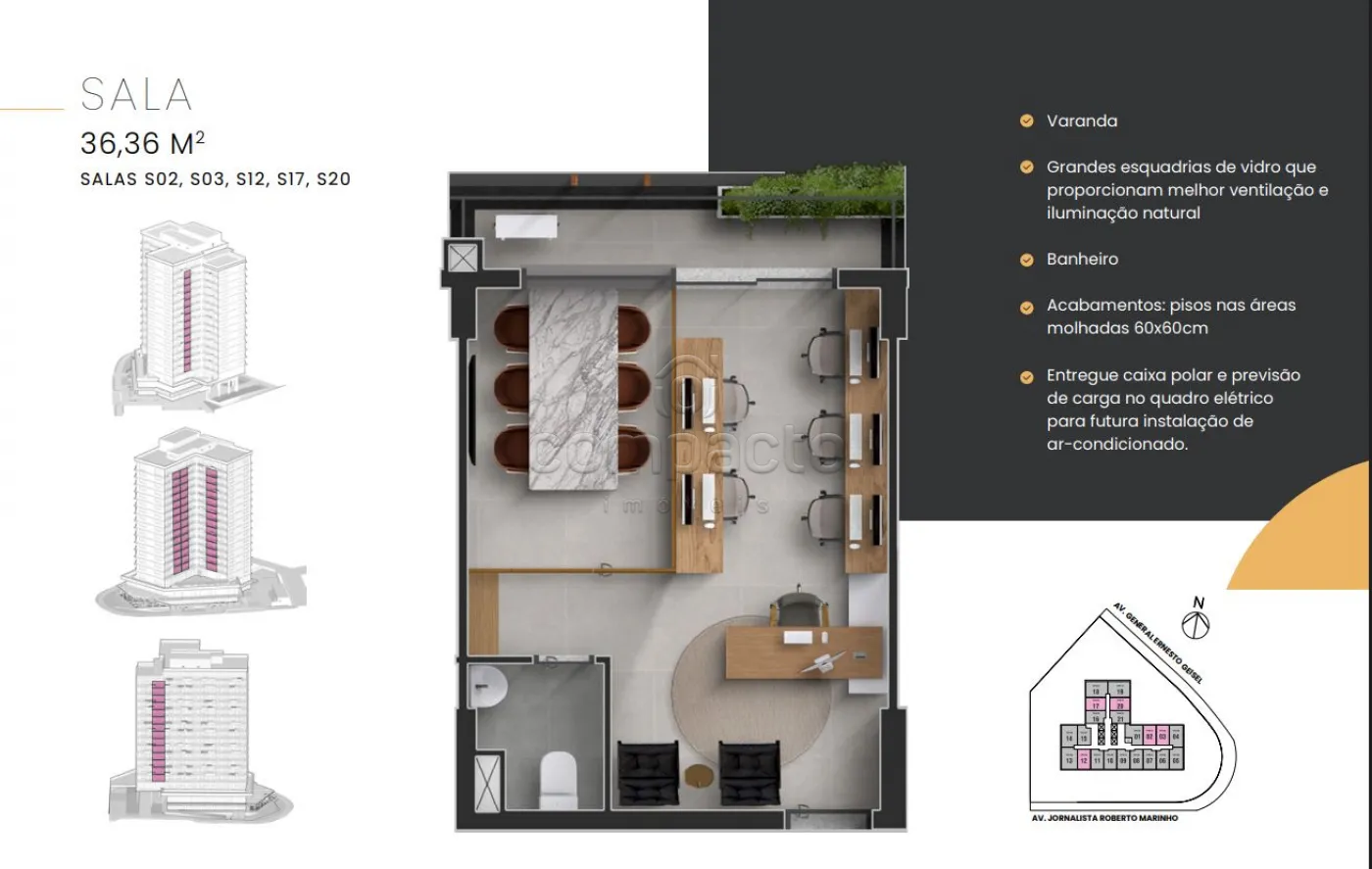 Salas com metragens a partir de aproximadamente 34 m² até 48 m², além de opções diferenciadas de rooftop com mais de 120 m².